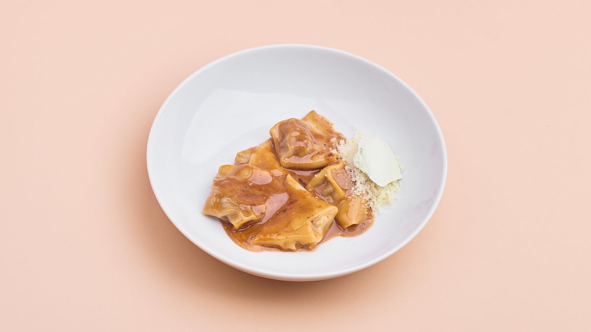 Długogotowany klarowny bulion z kaczki, soi i mirin, makaron ramen pszenny (robiony przez nas na miejscu), palony por, marynowane jajko "zerówka" z hodowli ekologicznej. Cena zawiera koszt opakowania na wynos oraz opłatę konsumencką zgodną z dyrektywą SUP. The price includes the cost of takeaway packaging and the consumer charge in accordance with the SUP Directive