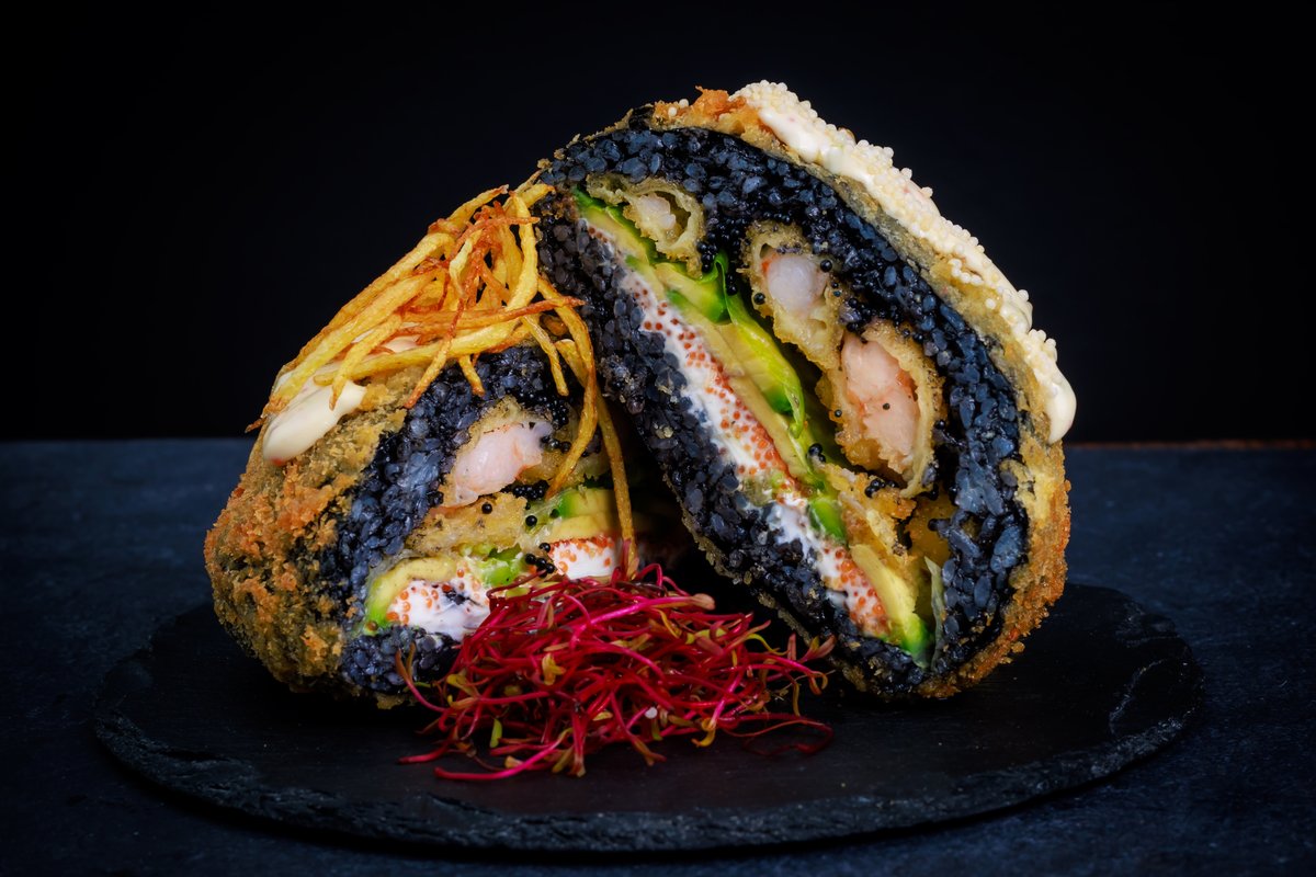 Tobiko czarne, krewetka w tempurze, por, mayo, ogórek, tykwa