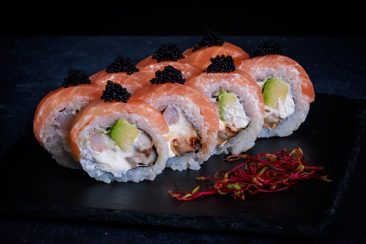 węgorz, łosoś, krewetka,ser Philadelphia ,awokado,ryż,tobiko czarne +sos sojowy, imbir,wasabi