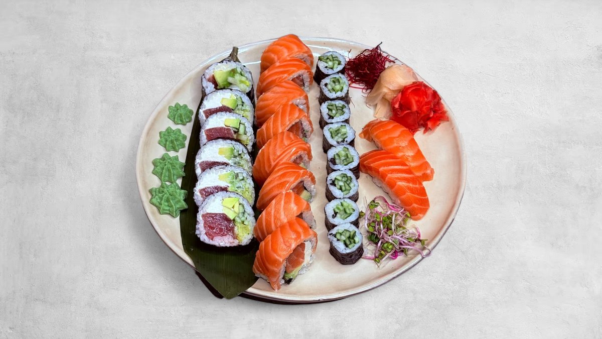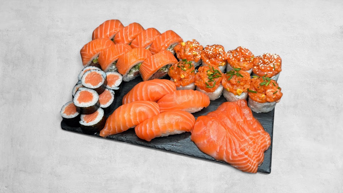 42 szt. 8x California łosoś opalany, opalany pieprz, serek philadelphia, avokado, łosoś pieczony 8x California łosoś/węgorz opalany, opalany czarny pieprz, serek, avokado, łosoś pieczony 6x Futomak łosoś pieczony, serek philadelphia, tykwa, avokado, sałata 6x Futomaki tuńczyk w tempurze, por, majo, ogórek, rzepa 6x Hosomaki avokado 6x Hosomaki ogórek 2x Nigiri łosoś opalany