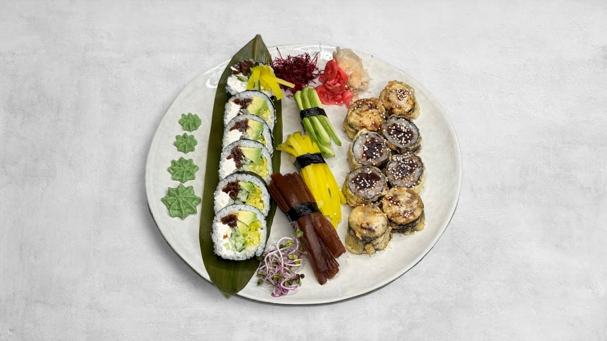 8x Hoso tykwa w tempurze 6x Futomaki vege z serkiem 1x Nigiri Awokado 1x Nigiri Oshinko 1x Nigiri Tykwa + imbir,wasabi,sos sojowy