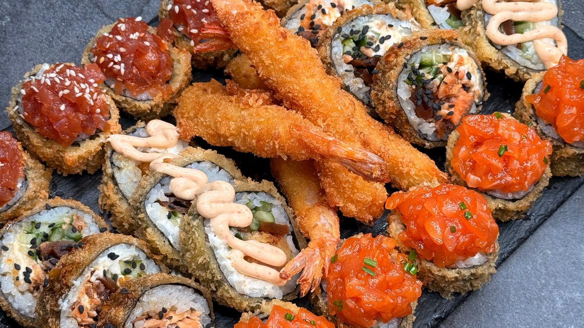 6x Futo krewetka w tempurze 6x Futo pieczony łosoś w tempurze 8x Hosomak tatar łosoś 8x Hosomak tatar tuńczyk 4x Krewetki w panko w tempurze +sos sojowy, imbir , wasabi, spicy mayo