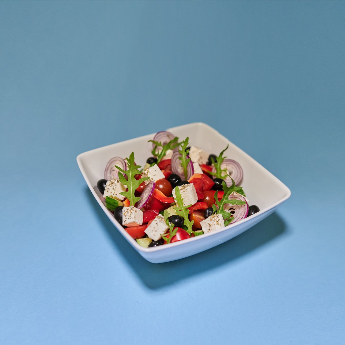 Pomidor cherry, ogórek, cebula, oliwki, ser Feta, oregano, pieprz czarny.