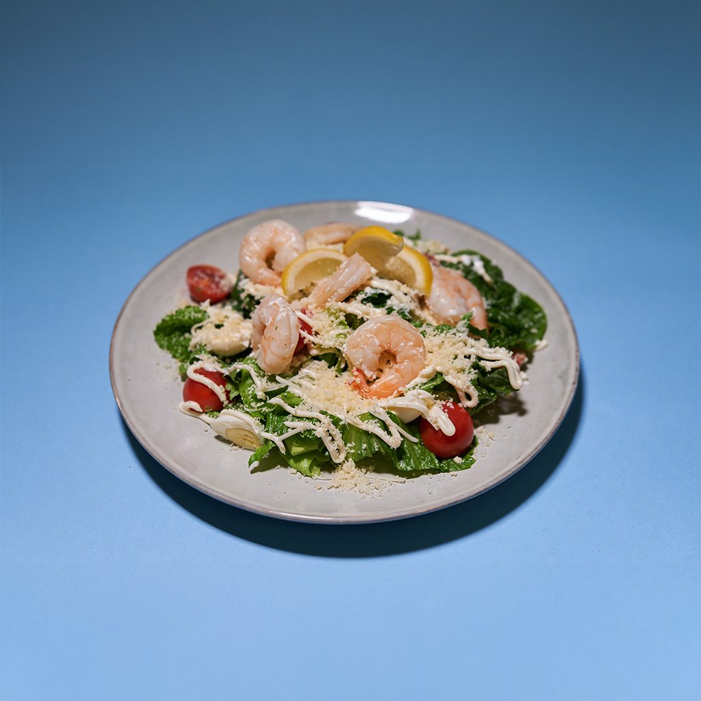 Sałata rzymska, pomidor cherry, krewetki (5 szt.), ser Parmezan, jajka przepiórcze w sosie cezar.