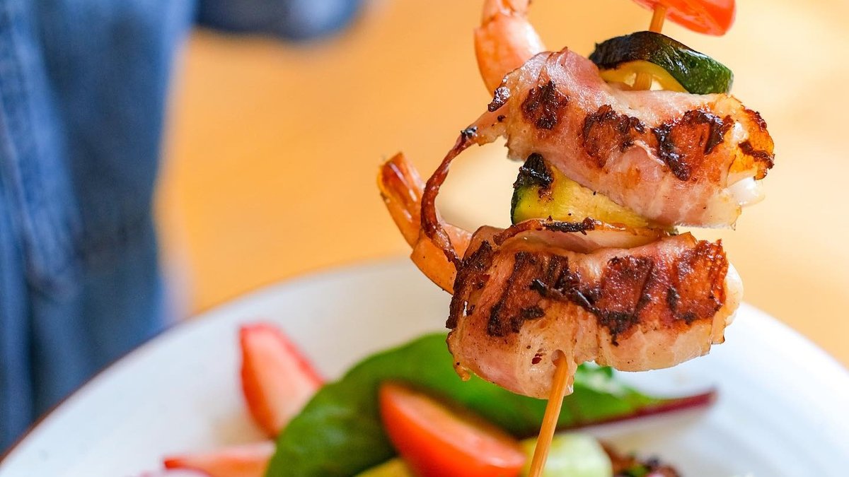 Grillowane krewetki owinięte w boczku i przekładane cukinią