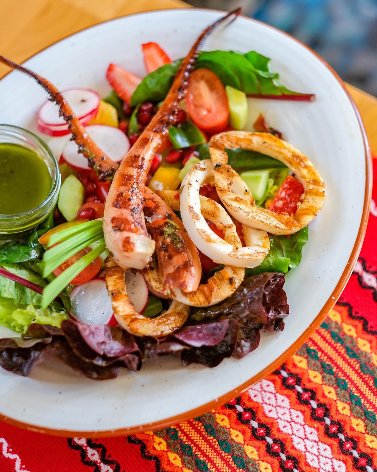Macki kalmara z rusztu podawane na sałacie z sosem. Zdjęcie poglądowe