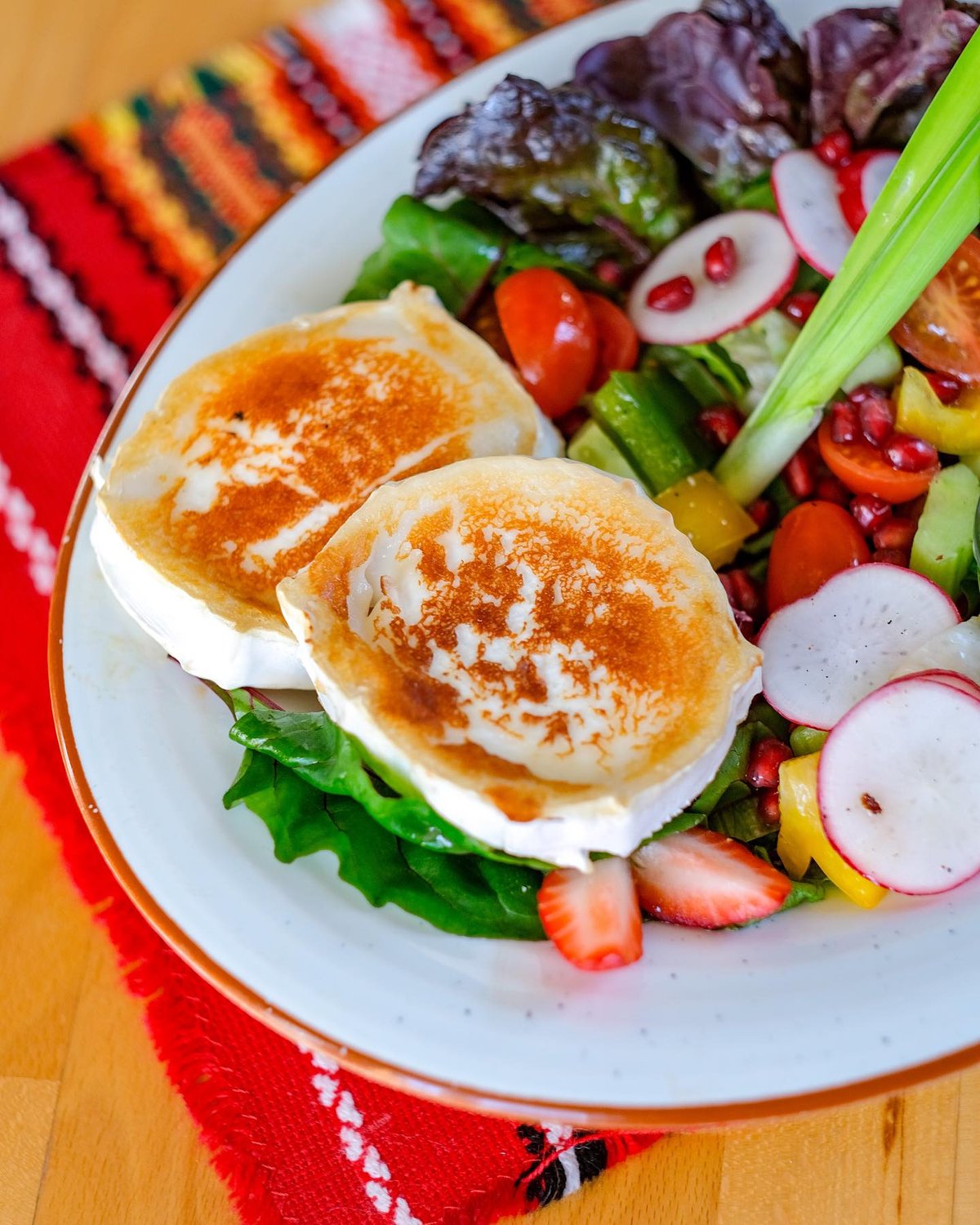 mix sałat podawany z sosem i świeżymi warzywami i zapiekanym kozim serem