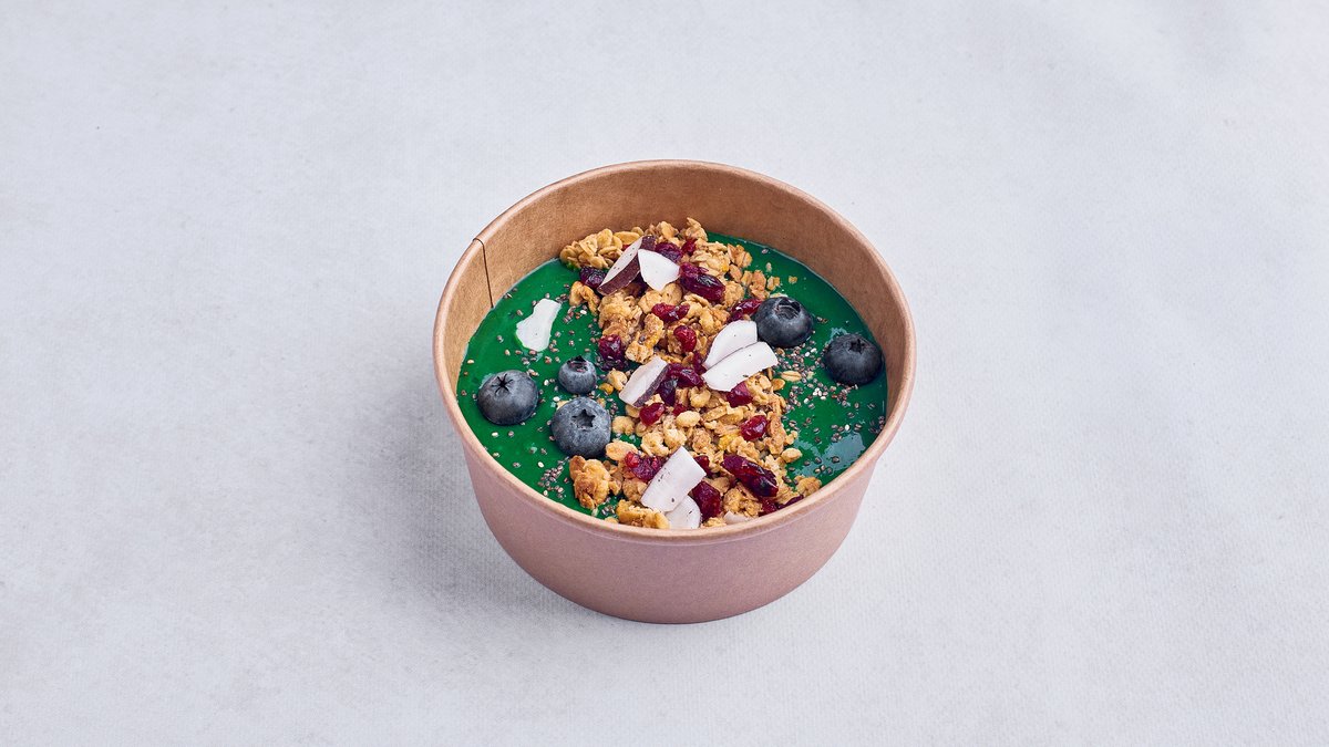 Banan, awokado, jabłko, ananas, szpinak, zielona spirulina, granola, borówka, suszona żurawina, chia