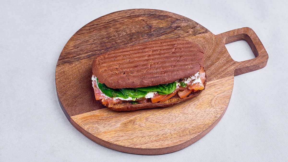 Łosoś gravlax, ser philadelphia, pomidor, szpinak, pasta truflowa, sos bazyliowo-pietruszkowy