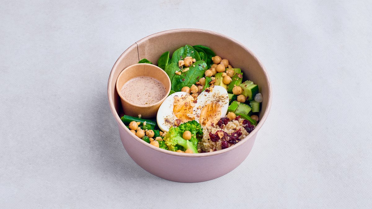 Komosa ryżowa, suszona żurawina, awokado, ogórek, szpinak baby, fasolka szparagowa, brokuły, jajo kurze, ciecierzyca, mieszanka orzechów, sos sezamowo-orzechowy