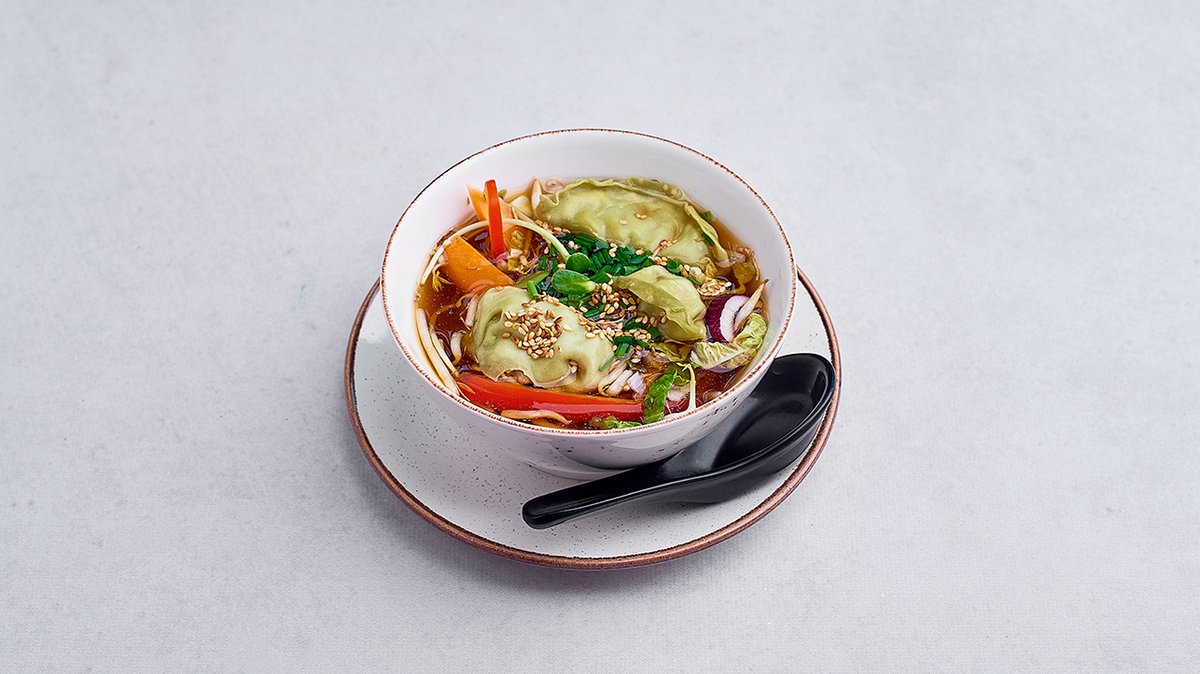 Tradycyjna zupa z serem tofu, łososiem, wakame i szczypiorkiem