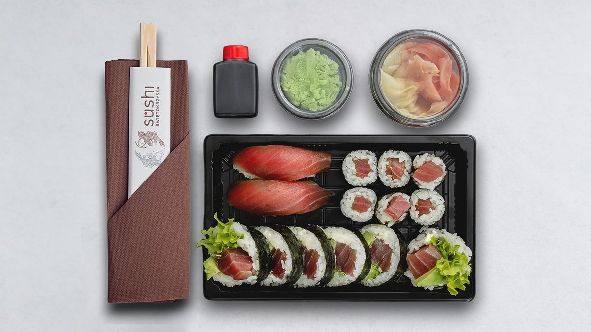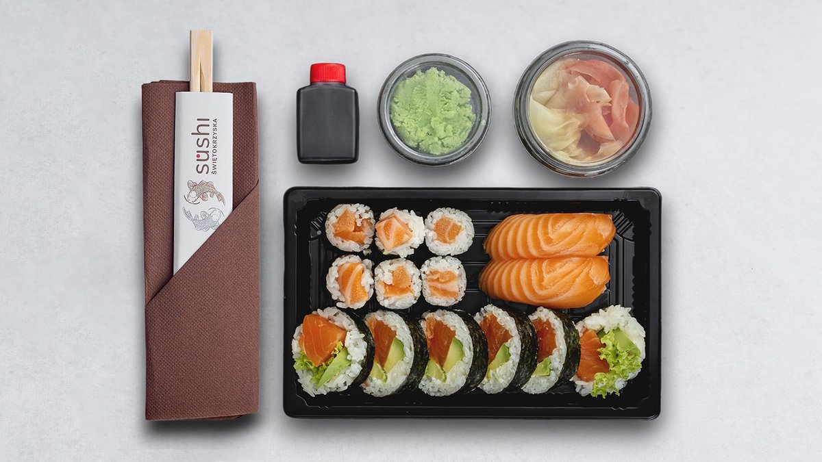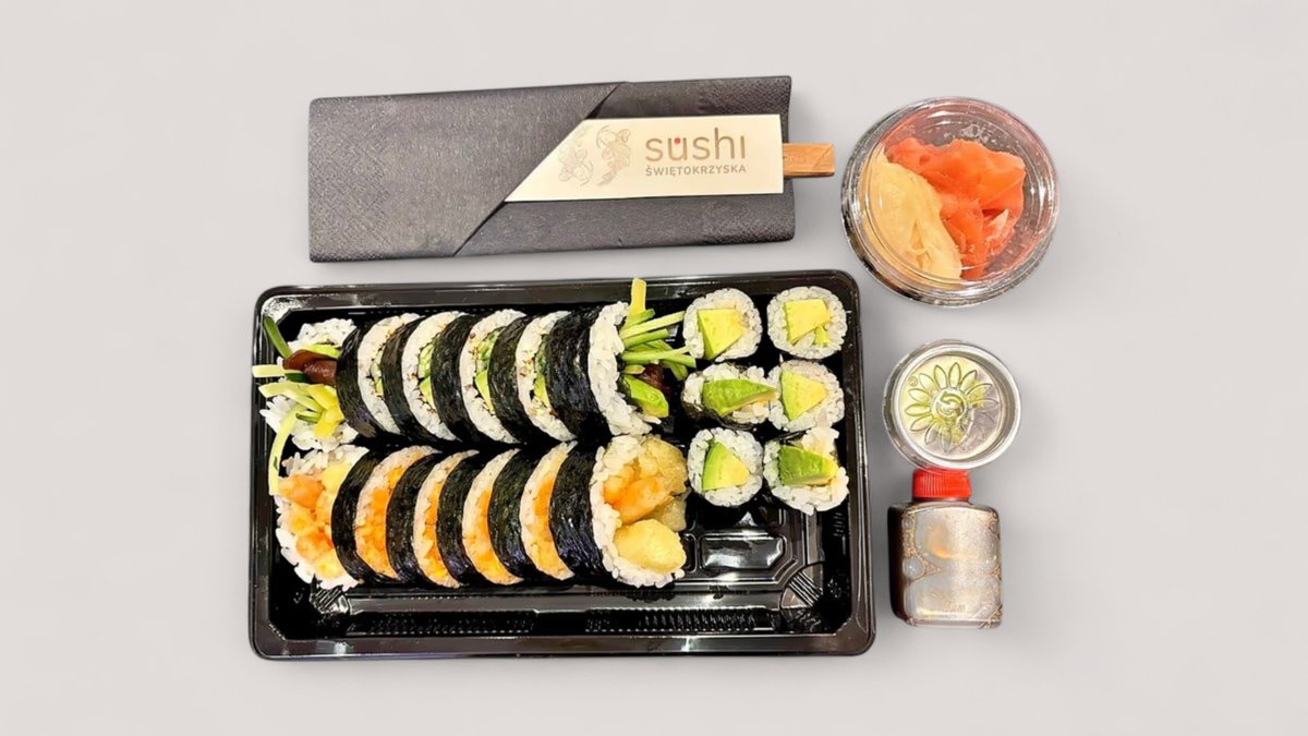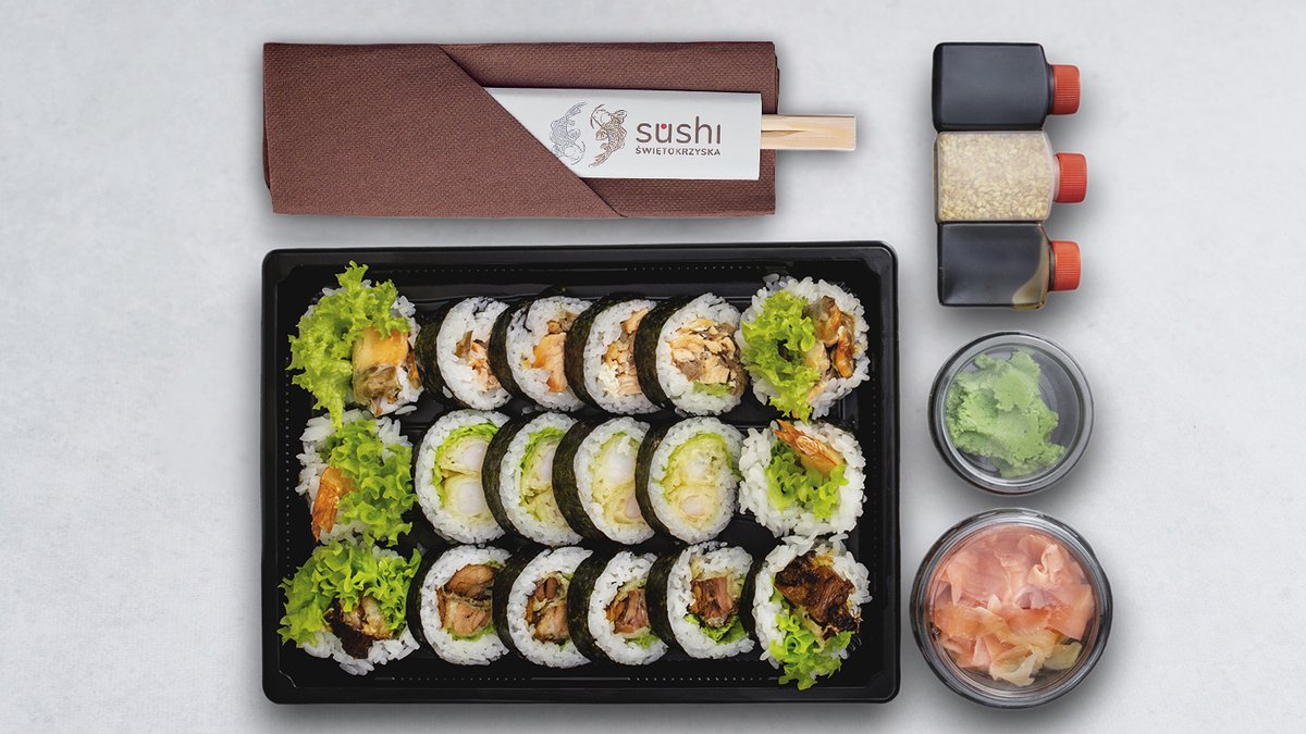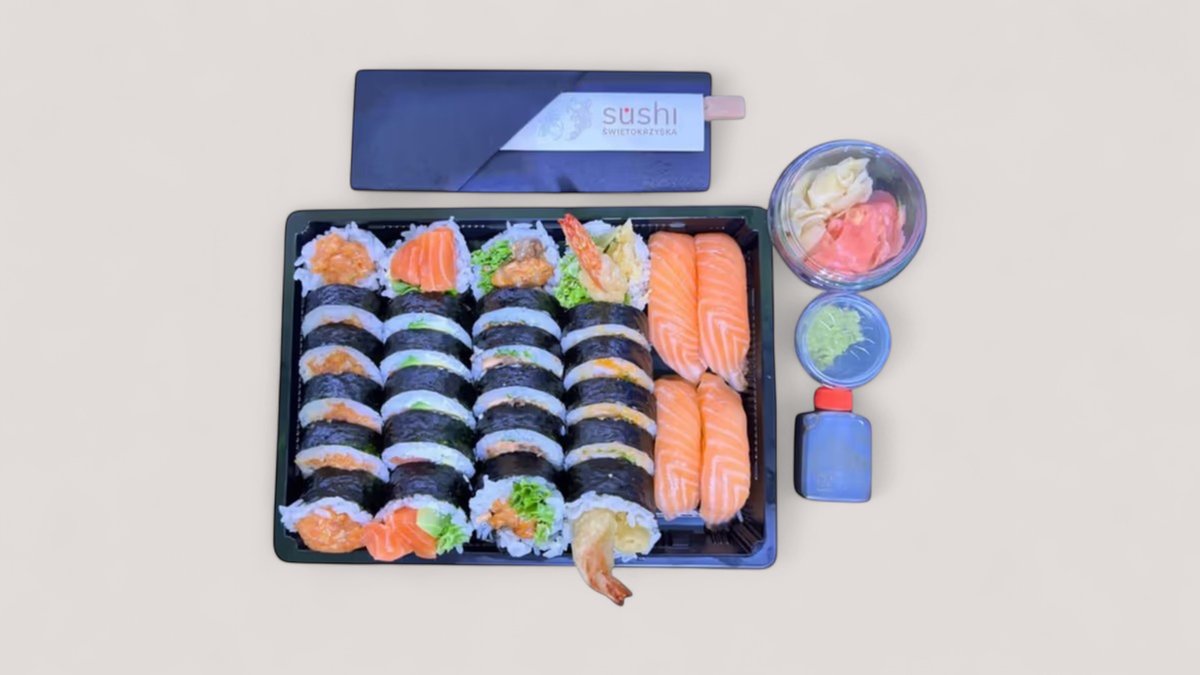 Nigiri z łososiem, Nigiri z tuńczykiem, Nigiri z tamago, Hosomaki z łososiem, Hosomaki z tuńczykiem, Futomaki szczepan - łosoś i paluszek krabowy, Philadelphia z łososiem, Futomaki z krewetką w tempurze