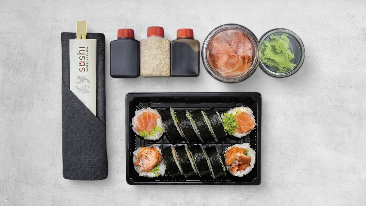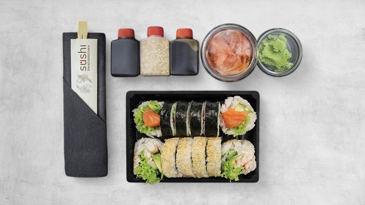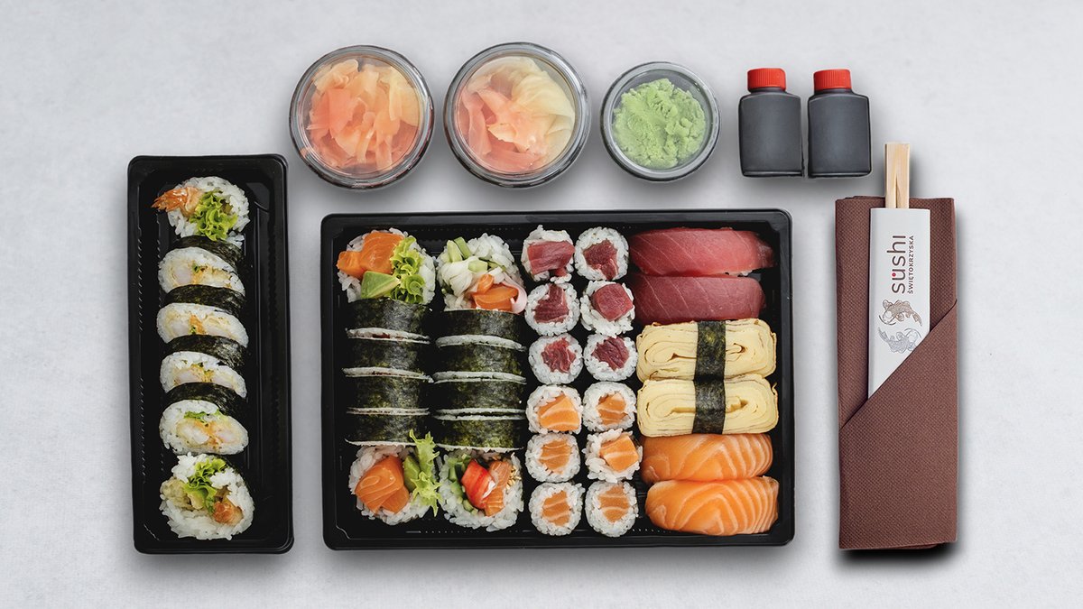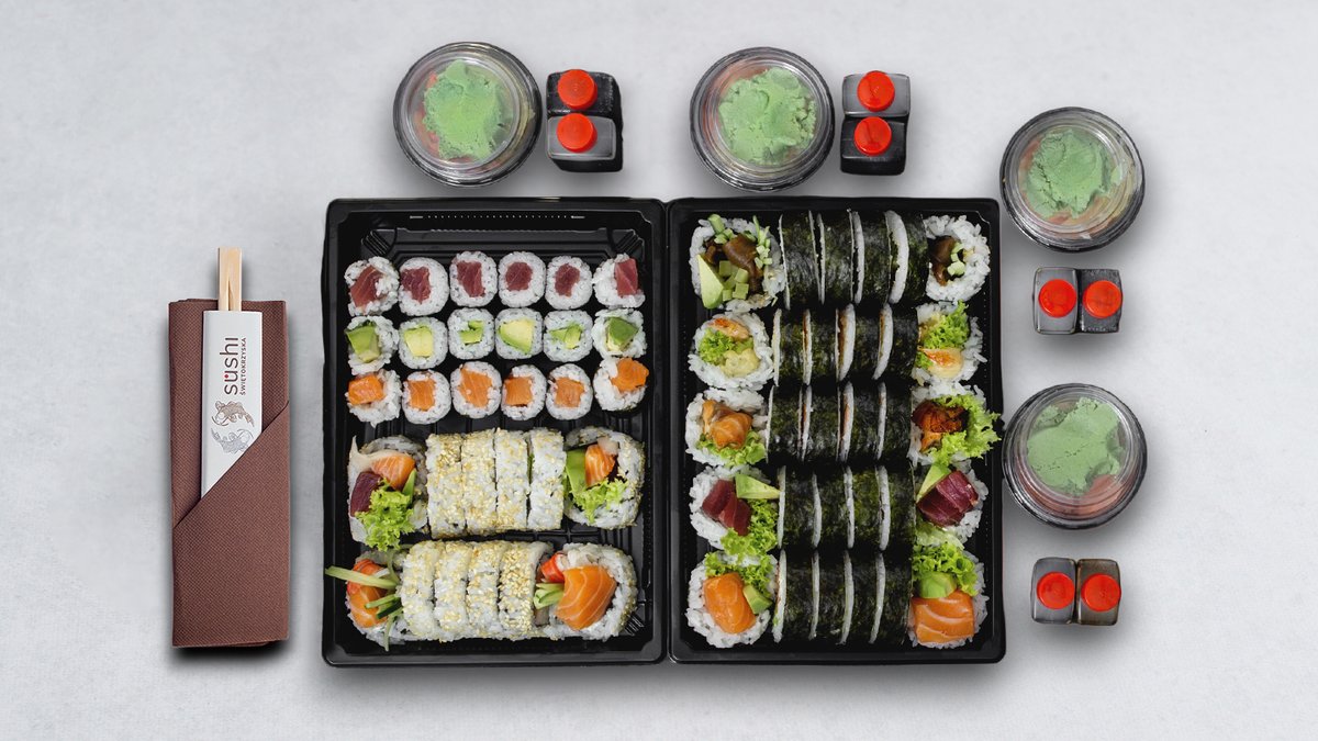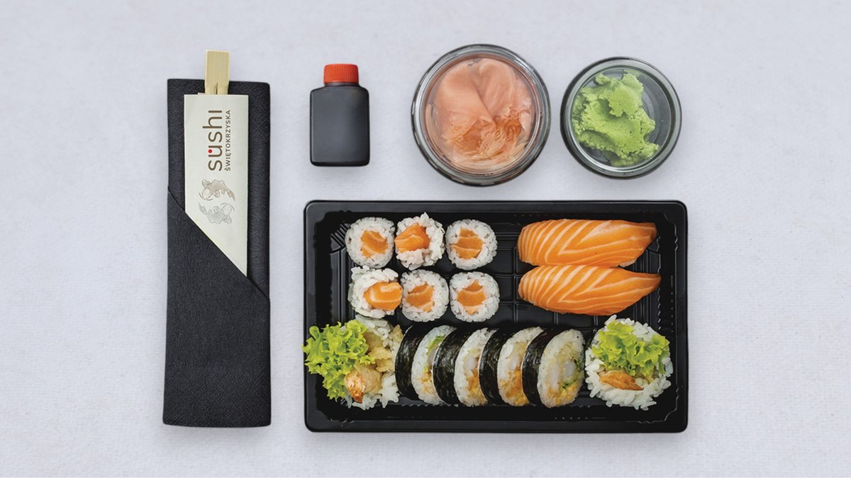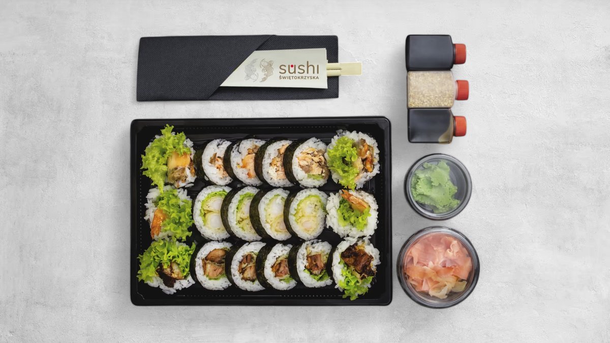 Nigiri z łososiem, Nigiri z tuńczykiem, Nigiri z tamago, Hosomaki z łososiem, Hosomaki z tuńczykiem, Futomaki szczepan - łosoś i paluszek krabowy, Philadelphia z łososiem, Futomaki z krewetką w tempurze