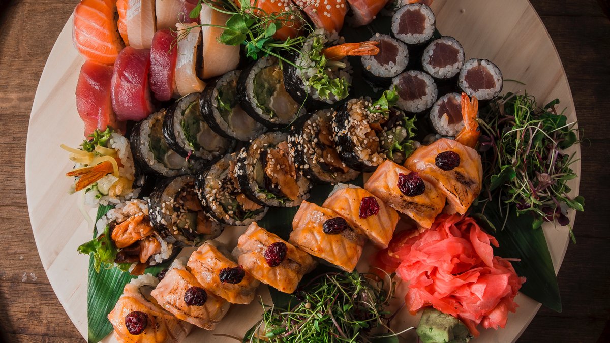 łosoś, serek, ogórek, zawijane w łososia, tuńczyka, rybę seriolę, krewetkę i avocado