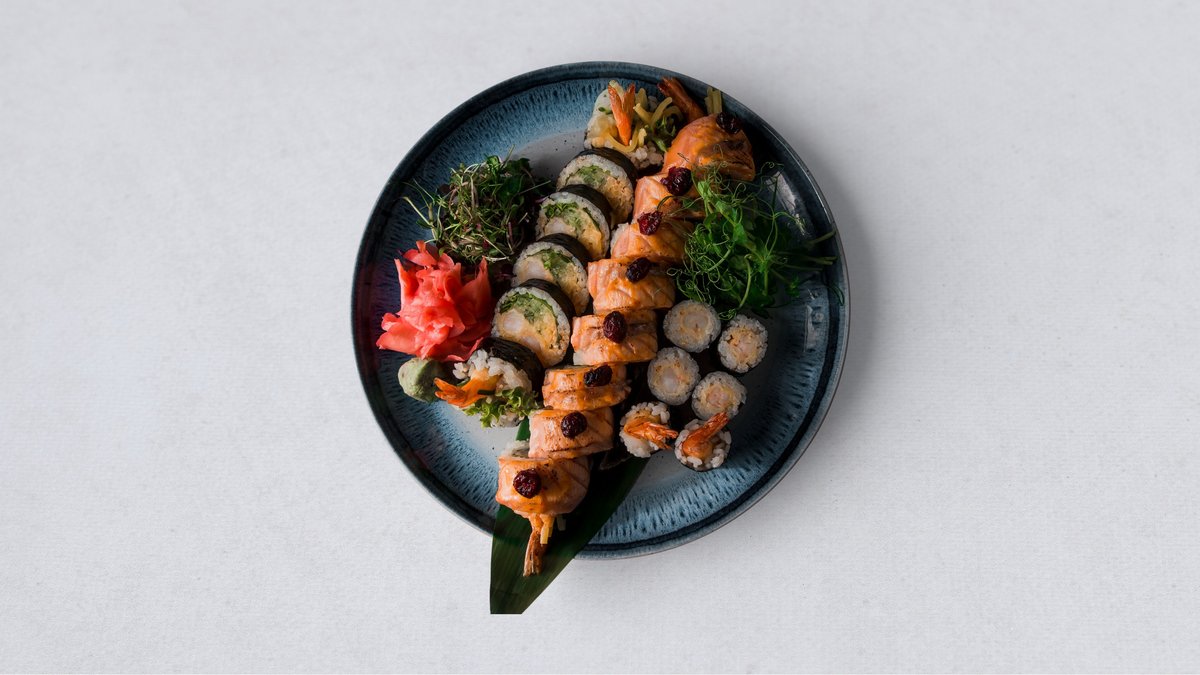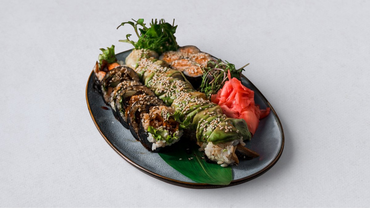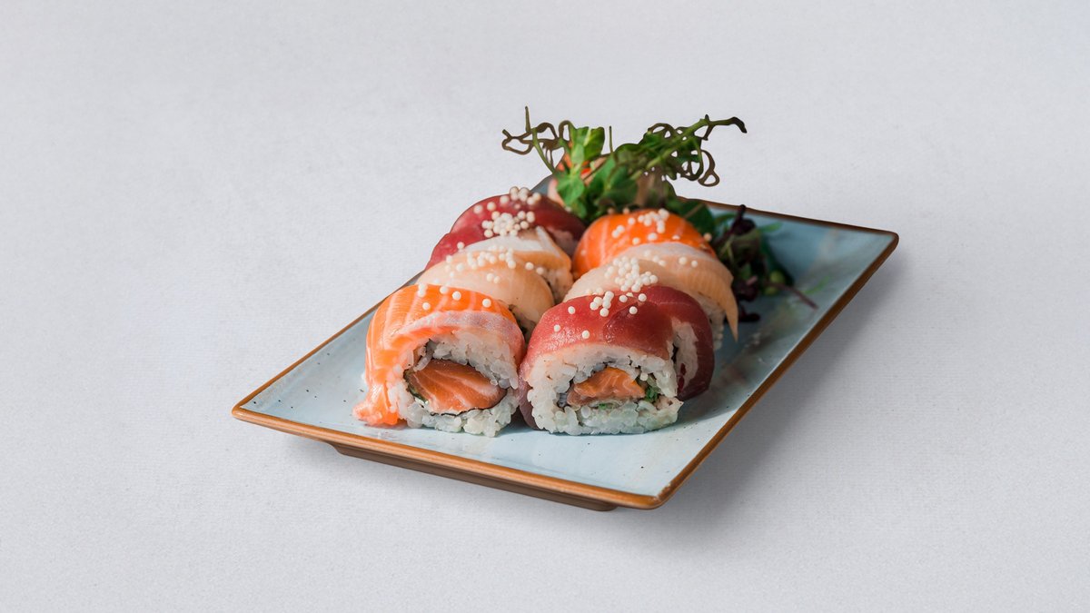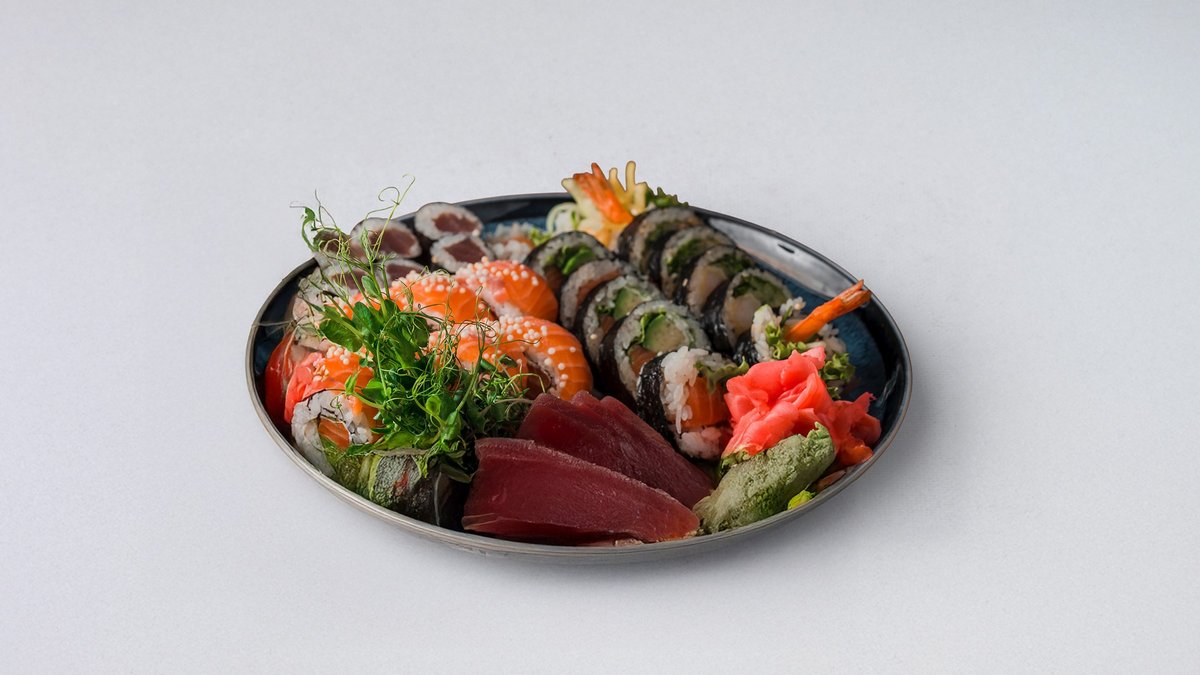 California Seriola 8 szt.California Gołd 8 szt, California Rainbow 8 szt Futomaki pieczony łosoś 6 szt.Futomaki krewetka w tempurze 6 szt. Hosomaki tuńczyk 6 szt