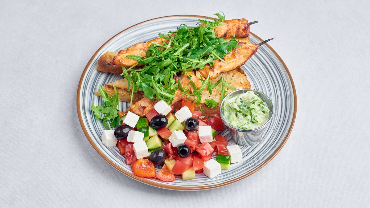 Szaszłyk z kurczaka z naszą domową foccacią, sałatką grecką z fetą i sosem tzatziki
