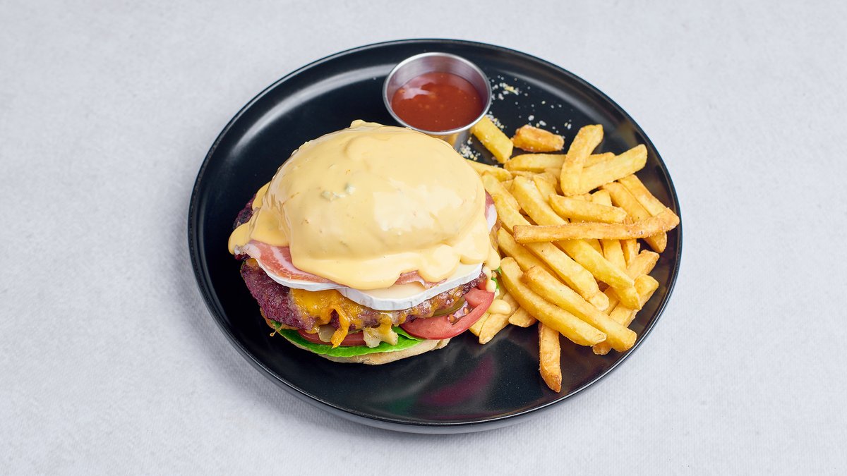 Specjalność poprzedniej restauracji 13 Rogów. Burger podawany w wędzonym dymie z dużą ilością sosu serowego i frytkami