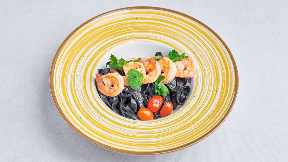 Czarne tagliatelle z krewetkami, pomidorkami cherry i sosem winno maślanym