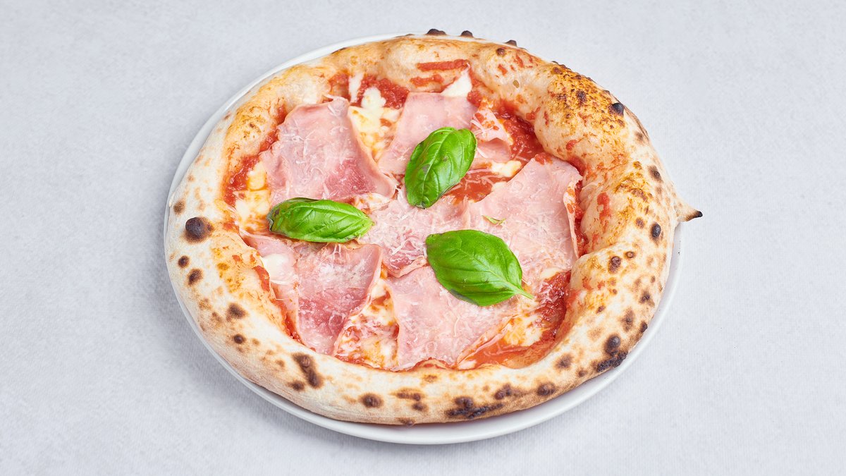 Na zielonym cieście, mozzarella fior di latte, sos pomidorowy San Marzano, Prosciutto Cotto, parmezan, bazylia