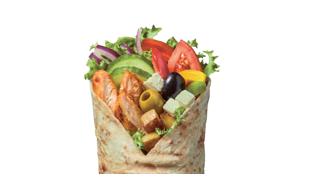 Tortilla, kurczak chilli, ser typu greckiego, ziemniaczki, pomidor, ogórek, cebula marynowana, oliwki, papryka, mix sałat, polecane sosy: Vegan Aioli i Green