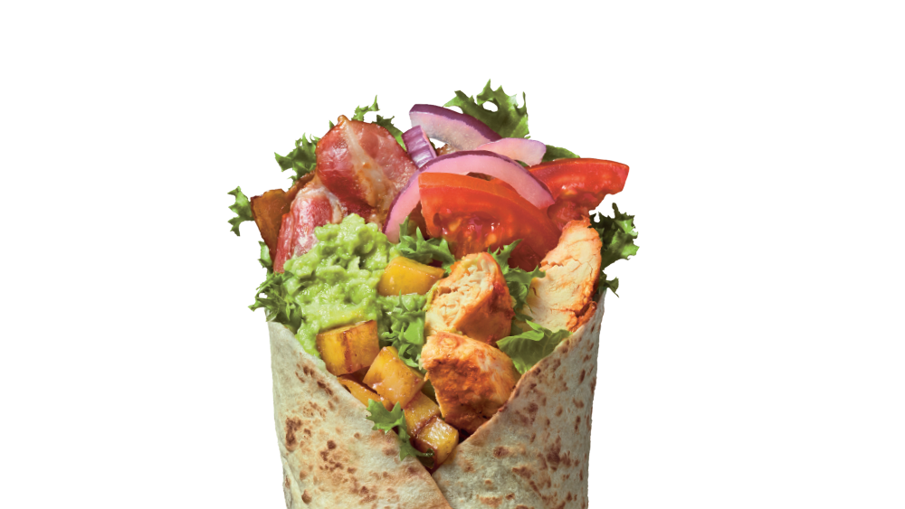 Tortilla, kurczak chilli, bekon, guacamole, ziemniaczki, pomidor, cebula marynowana, mix sałat, polecane sosy: Musztardowo Miodowy i Vegan Aioli