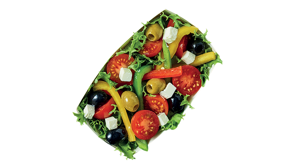 Mix sałat, papryka, pomidory cherry, mix oliwek, ser typu greckiego, polecany sos: Green