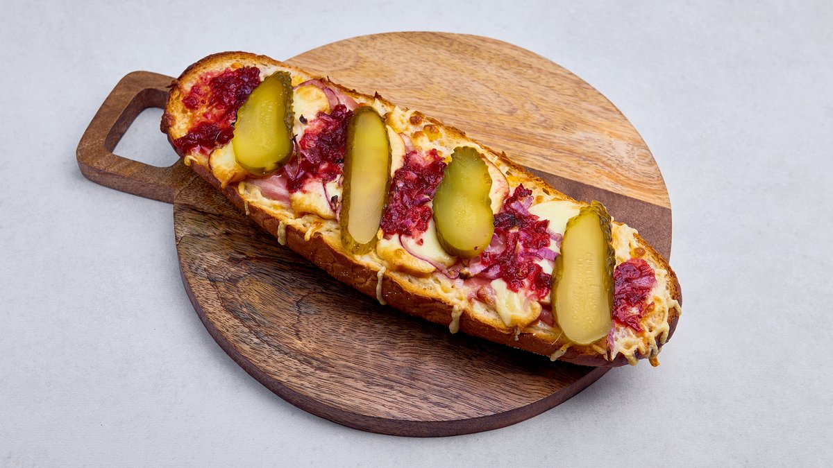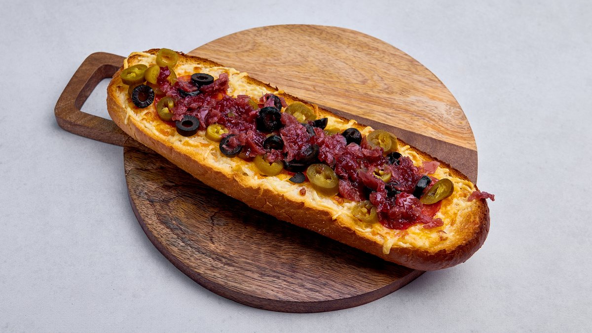 Ser, kiełbasa chorizo, domowy chutney z czerwonej cebuli, marynowane jalapeño, czarne oliwki