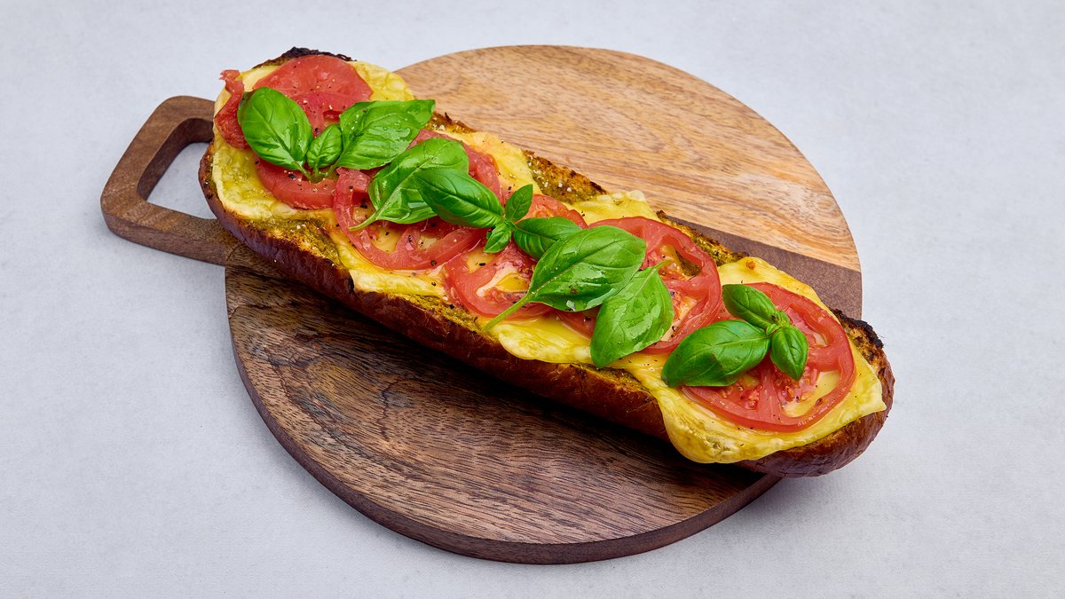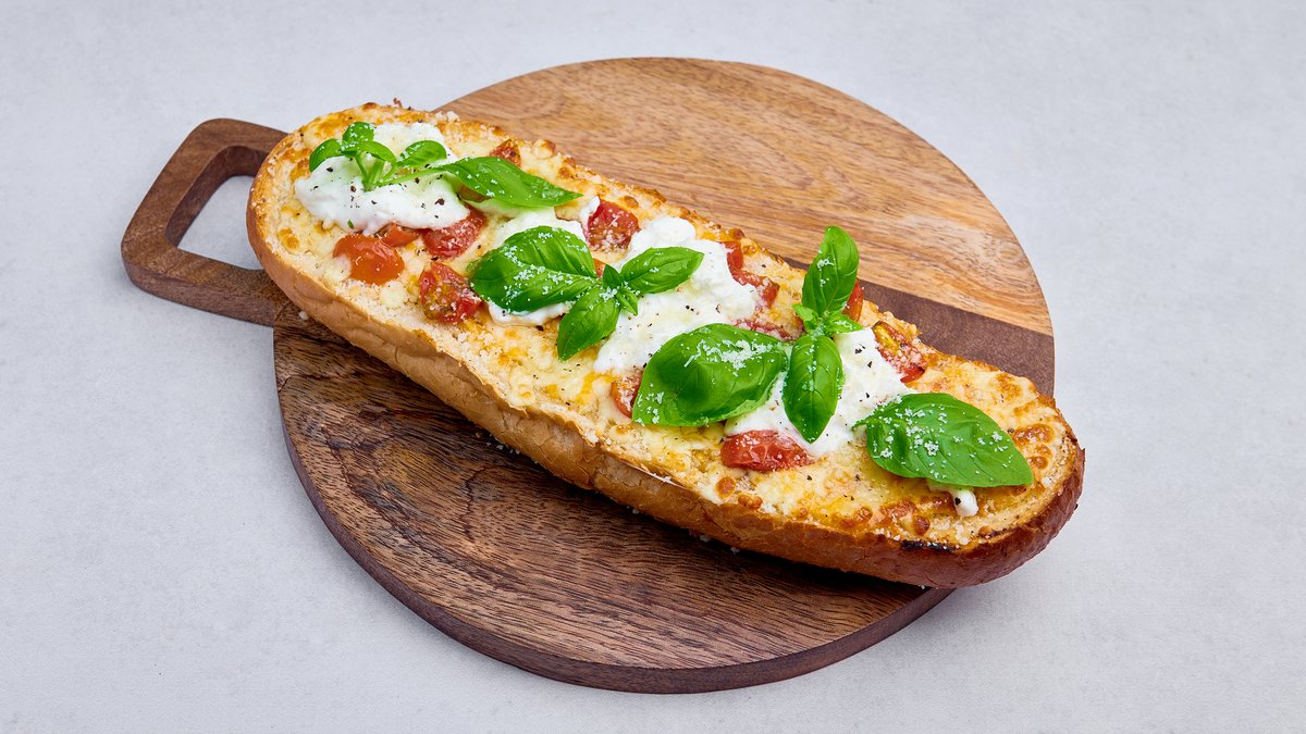 Ser, masło czosnkowe, zapiekane pomidorki cherry, burrata, liście bazylii, parmezan, oliwa czosnkowa