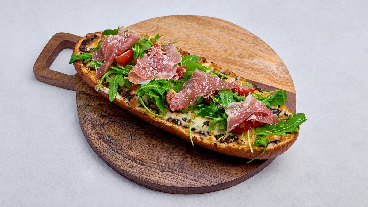 Ser, pieczarki, szynka parmeńska, pomidorki cherry, rucola, parmezan, oliwa czosnkowa