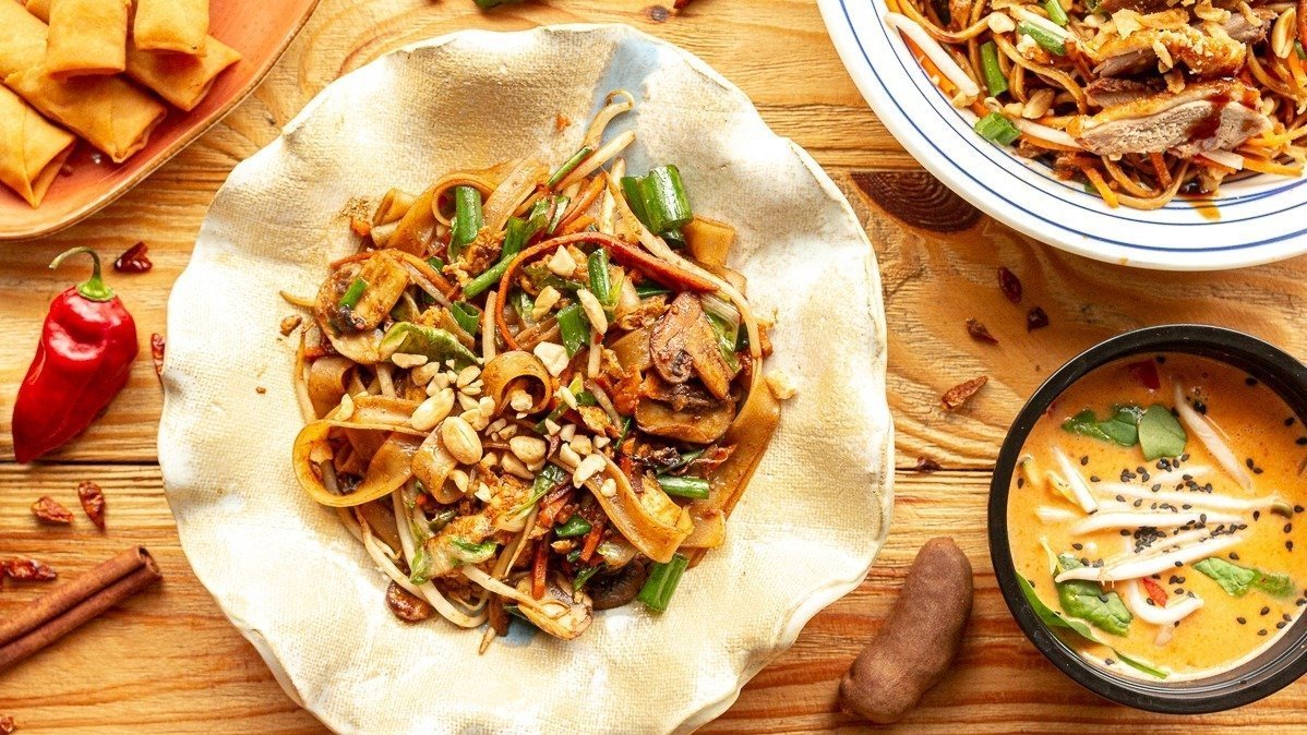 Ramen bar oferujący kremowe, klarowne lub lekkie, wegańskie rameny oraz loaded fries z dodatkami.