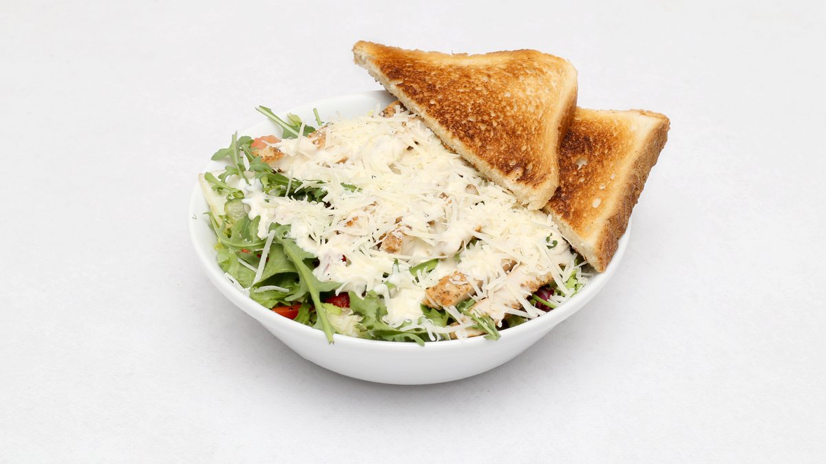 Z grillowanym kurczakiem, warzywami, grzankami i parmezanem, sos vinegret i sos cezar