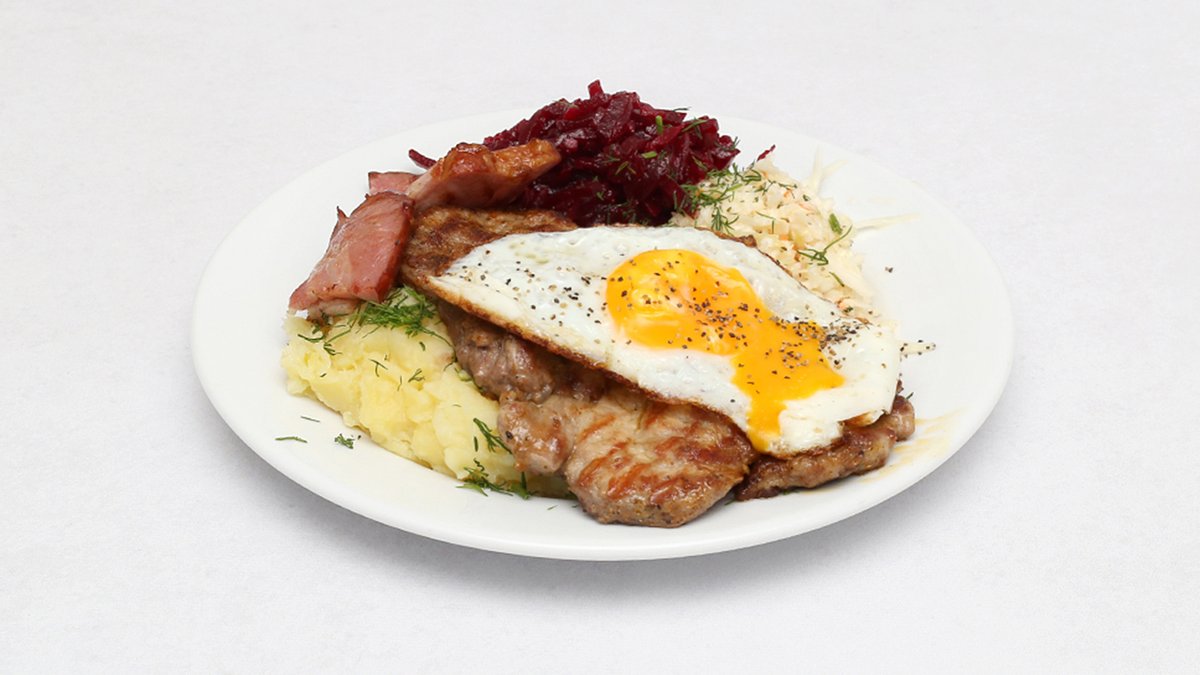 Z plastrem boczku i jajkiem sadzonym, podawany z ziemniakami i surówka