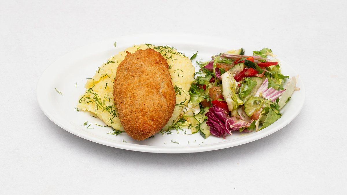 Z masełkiem ziołowym i serem, podawany z ziemniakami i lekką sałatką