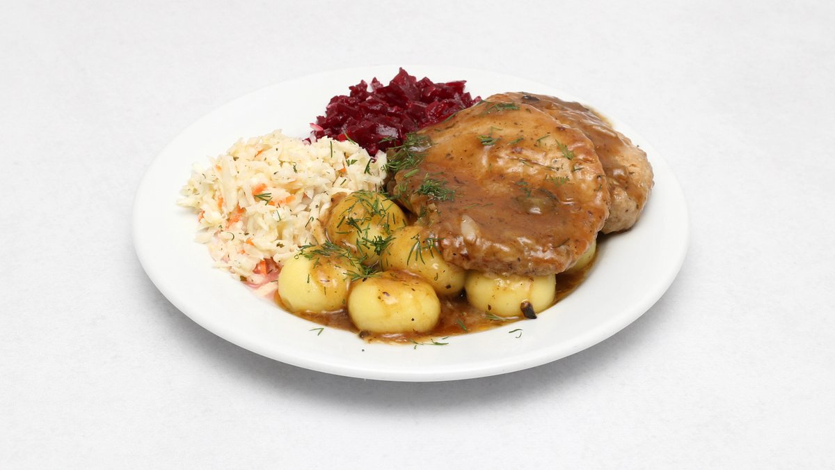 W sosie pieczeniowym, podawane z kluskami śląskimi i buraczkami