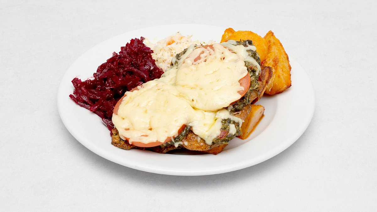 Grillowany i zapieczony ze szpinakiem, suszonym pomidorem i serem, podawany z pieczonymi ziemniakami i lekką sałatką