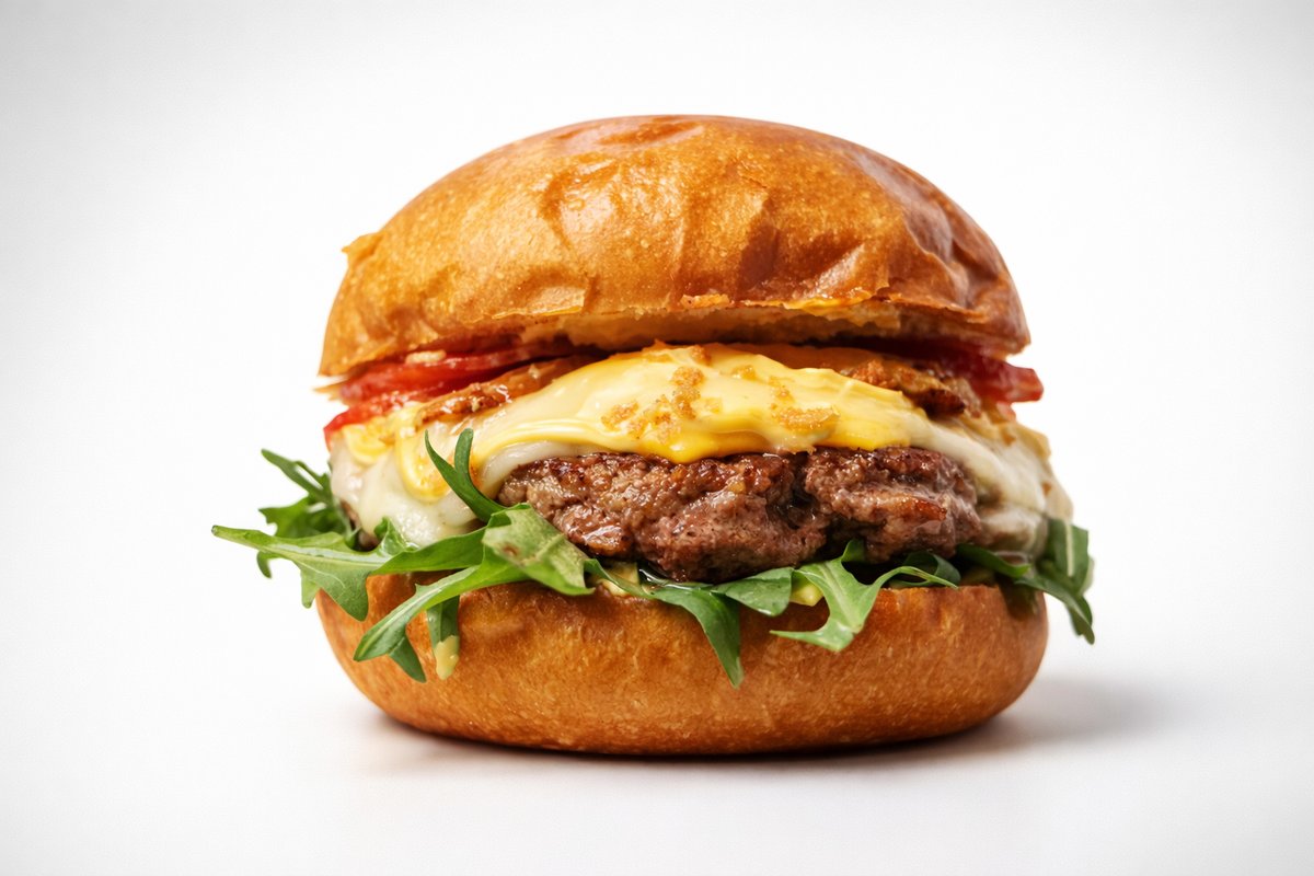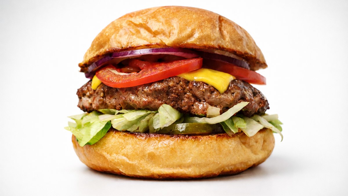 100% wołowina, cheddar i klasyczne sosy. Bułeczka brioche · 100% mięsa wołowego · ser cheddar · cebula · pomidor · sałata · ogórek kiszony · musztarda · ketchup