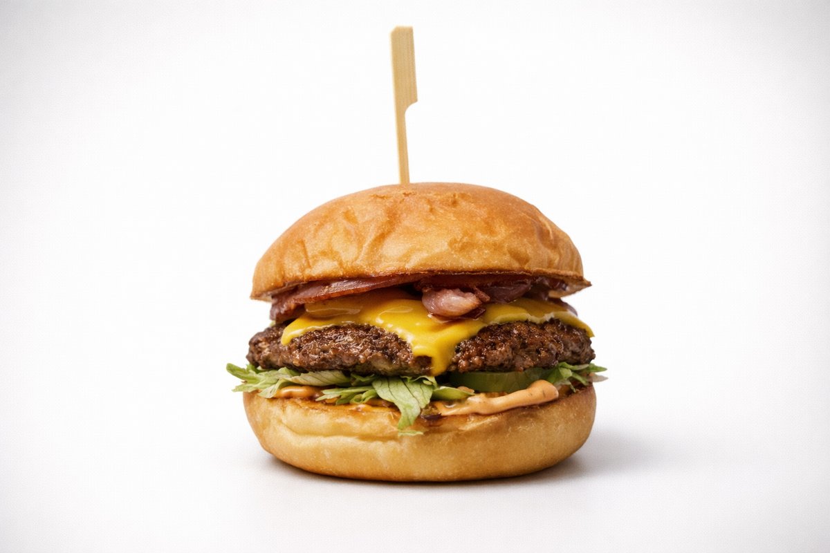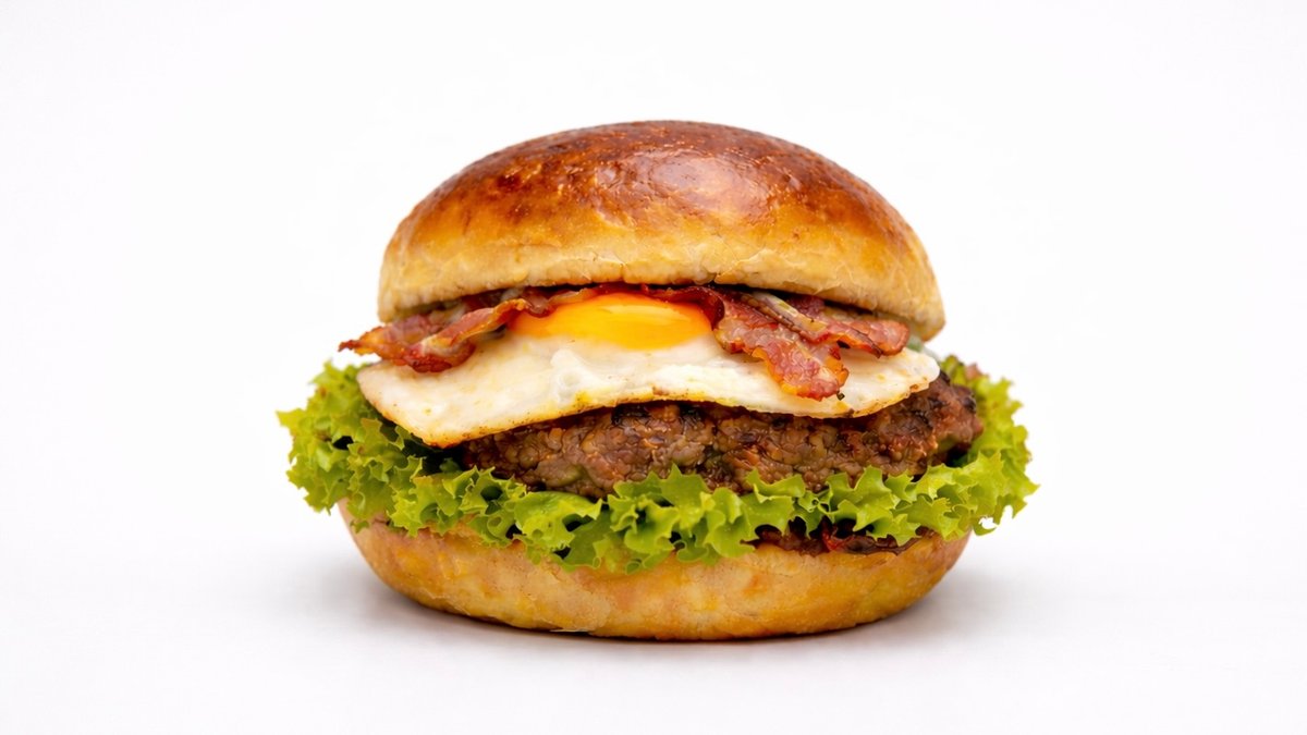 100% wołowina, jajko sadzone, bekon i sos BBQ. Bułeczka brioche · 100% mięsa wołowego · chrupiący bekon · jajko sadzone · smażona cebula · sałata · ogórek kiszony · sos majonezowy · sos BBQ Frytki do wyboru.