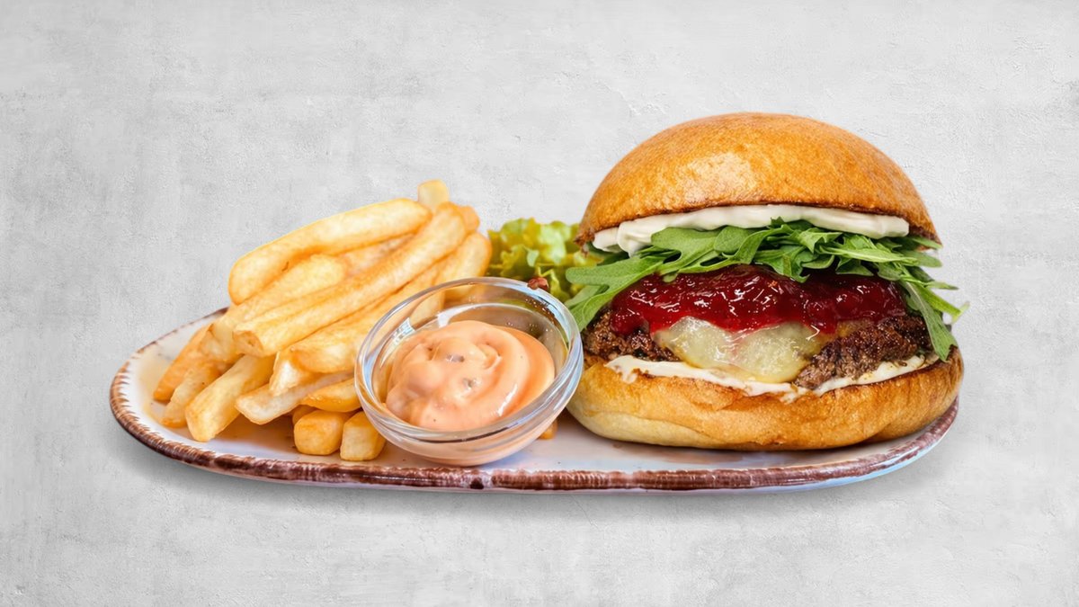 Wołowina, camembert, bekon, żurawina i sos miodowo-musztardowy. Puszysta bułeczka brioche z soczystą wołowiną, chrupiącym bekonem i kremowym camembertem. Słodka żurawina, świeża rukola i sos miodowo-musztardowy idealnie łączą smaki. Frytki do wyboru.
