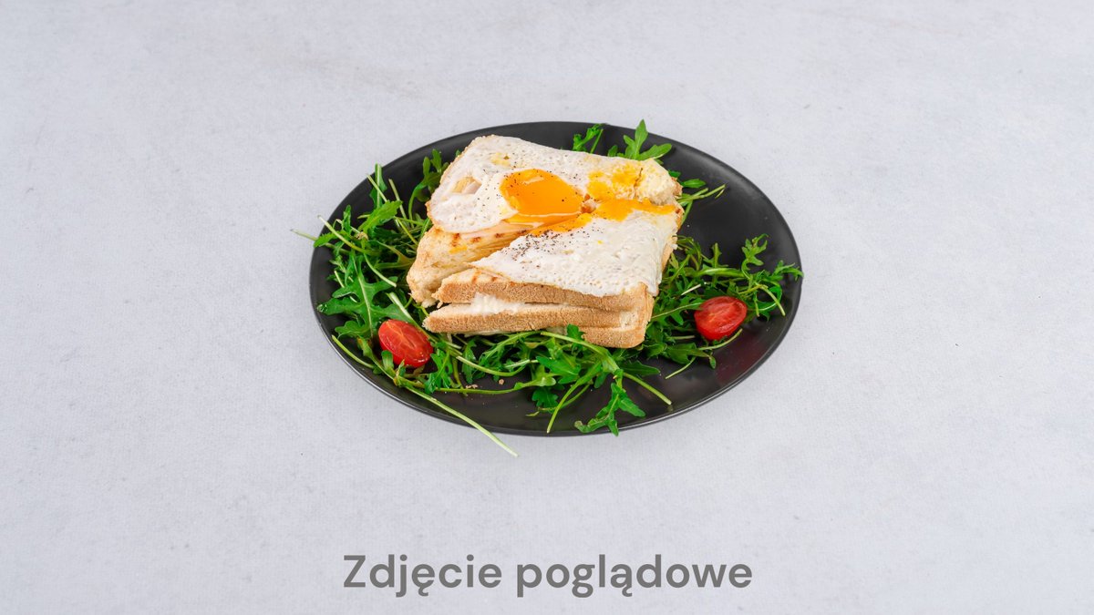 Tost z brioche z szynką, serem oraz sosem musztardowym, sos beszamelowy, jajko sadzone, mix sałat z pomidorkami cherry