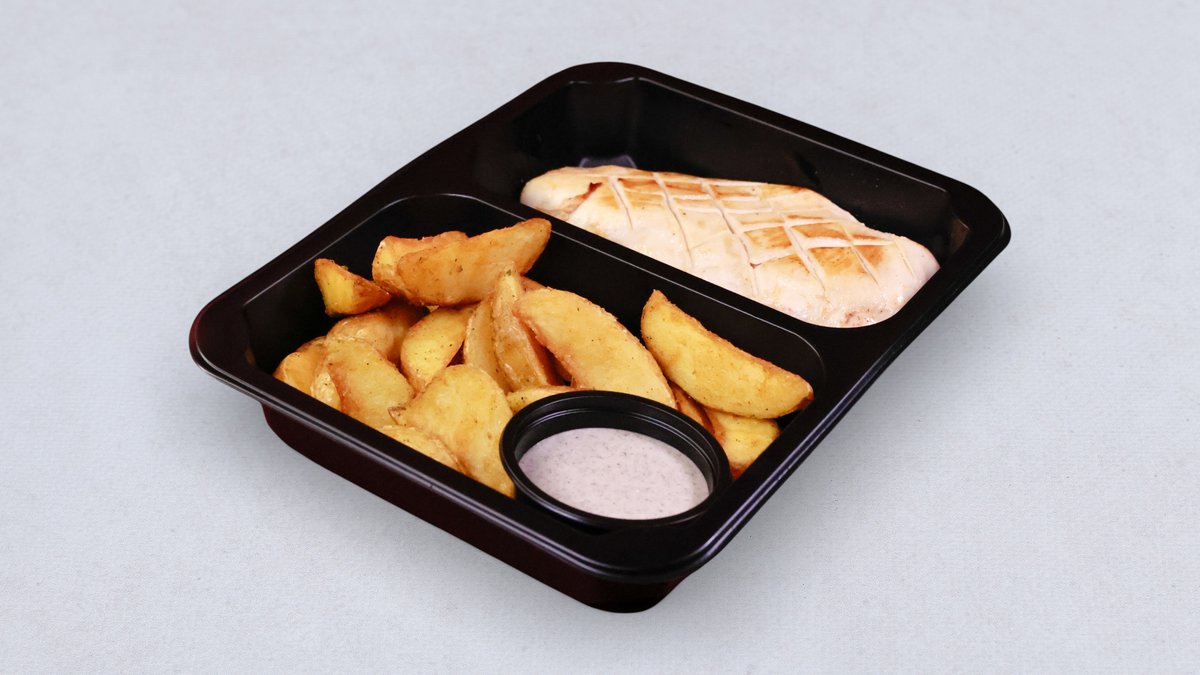 Filet z kurczaka w aromatycznym sosie grzybowym, podawany z chrupiącymi ziemniakami po wiejsku, krojonymi w apetyczne łódeczki z sałatką colesław i sosem czosnkowym