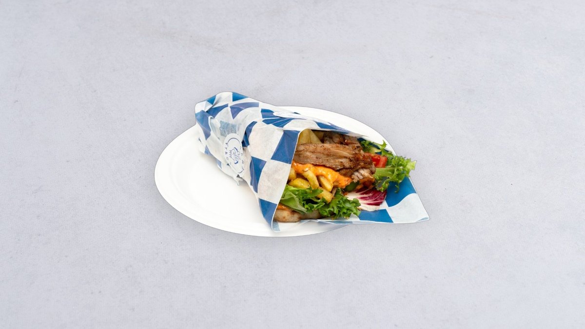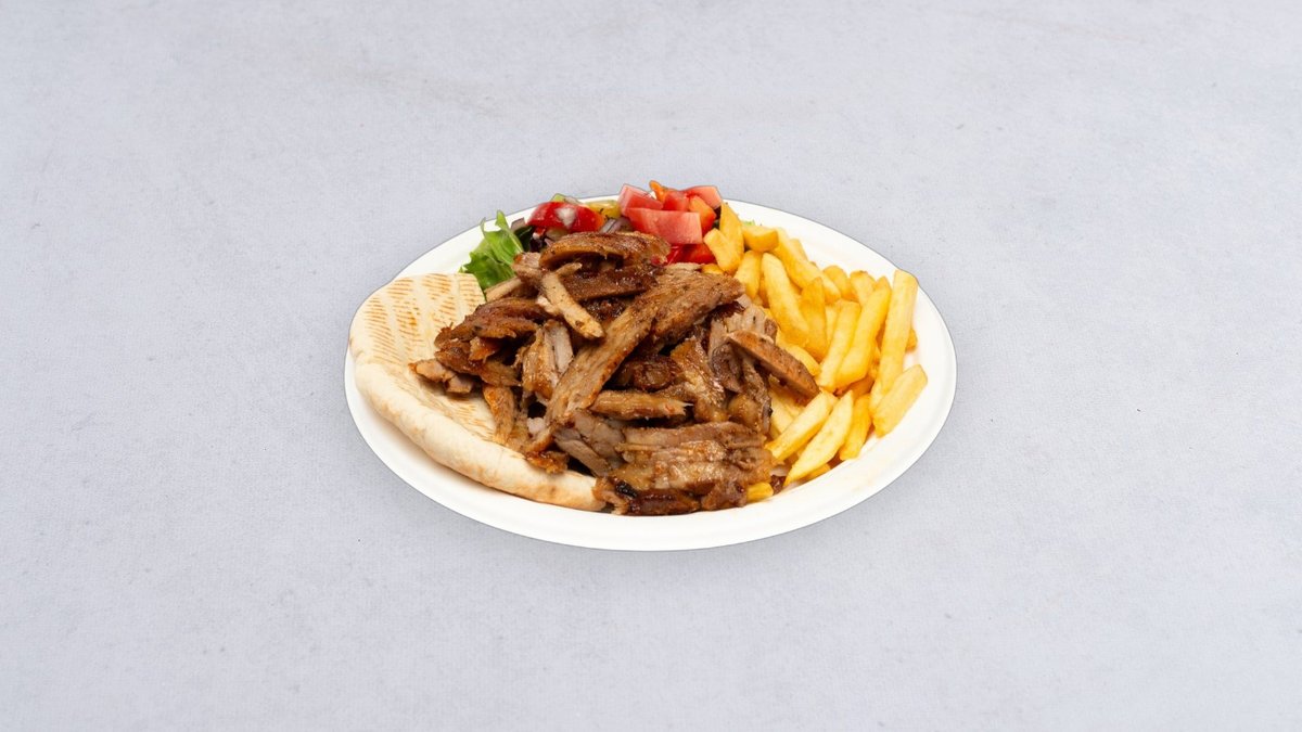 Mięso wieprzowe, sałatka, frytki, sos tzatziki do wyboru, pita osobno
