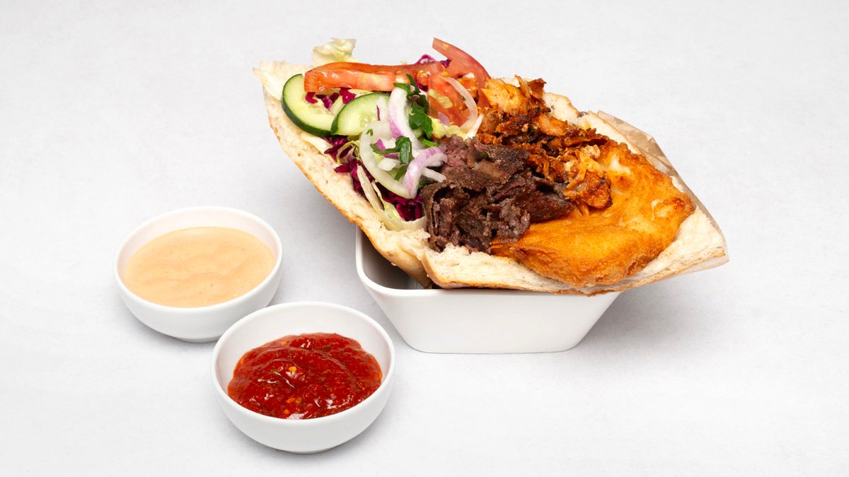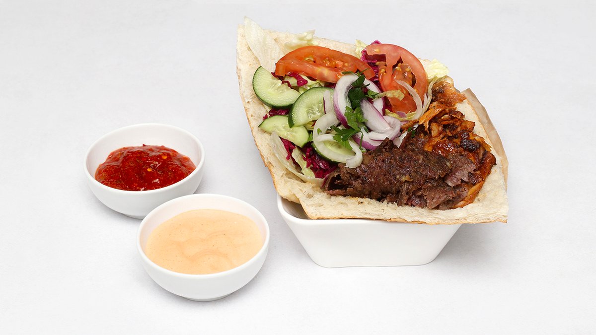 Lawasz lub pita, sos, mięso 180 g, warzywa