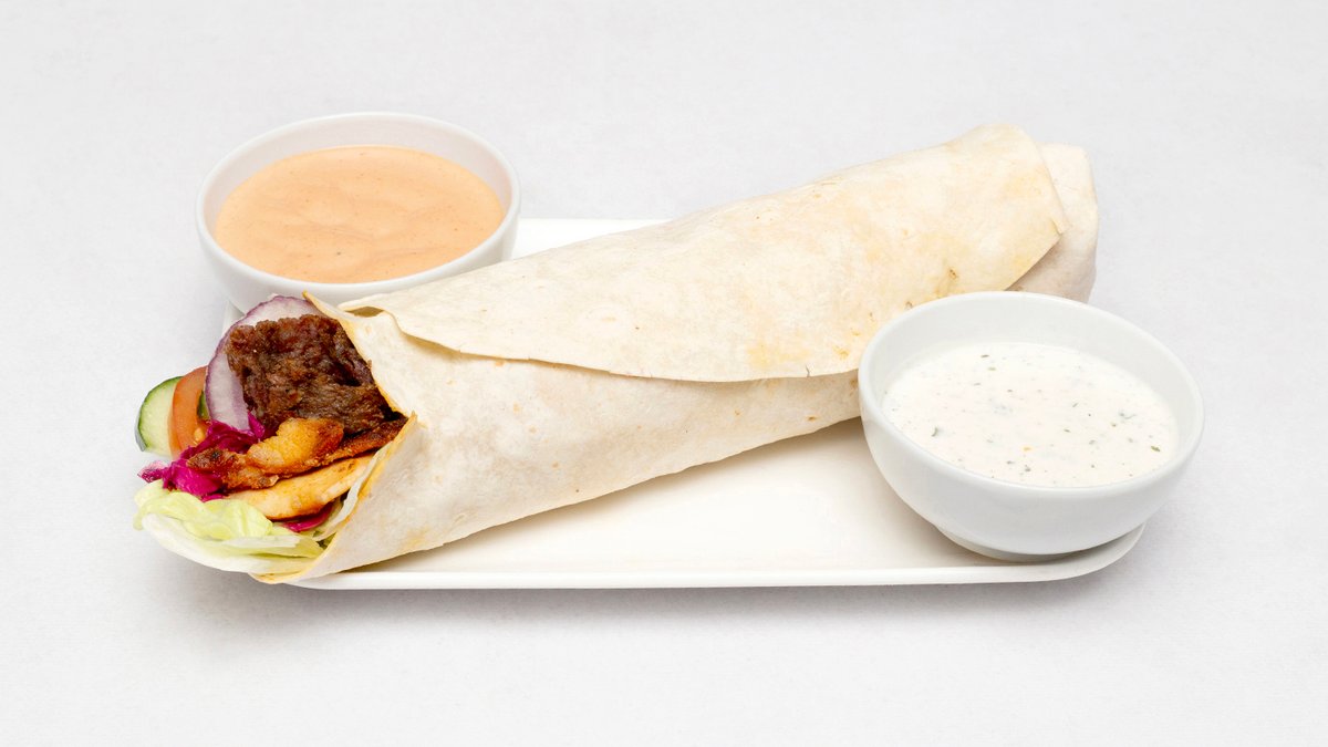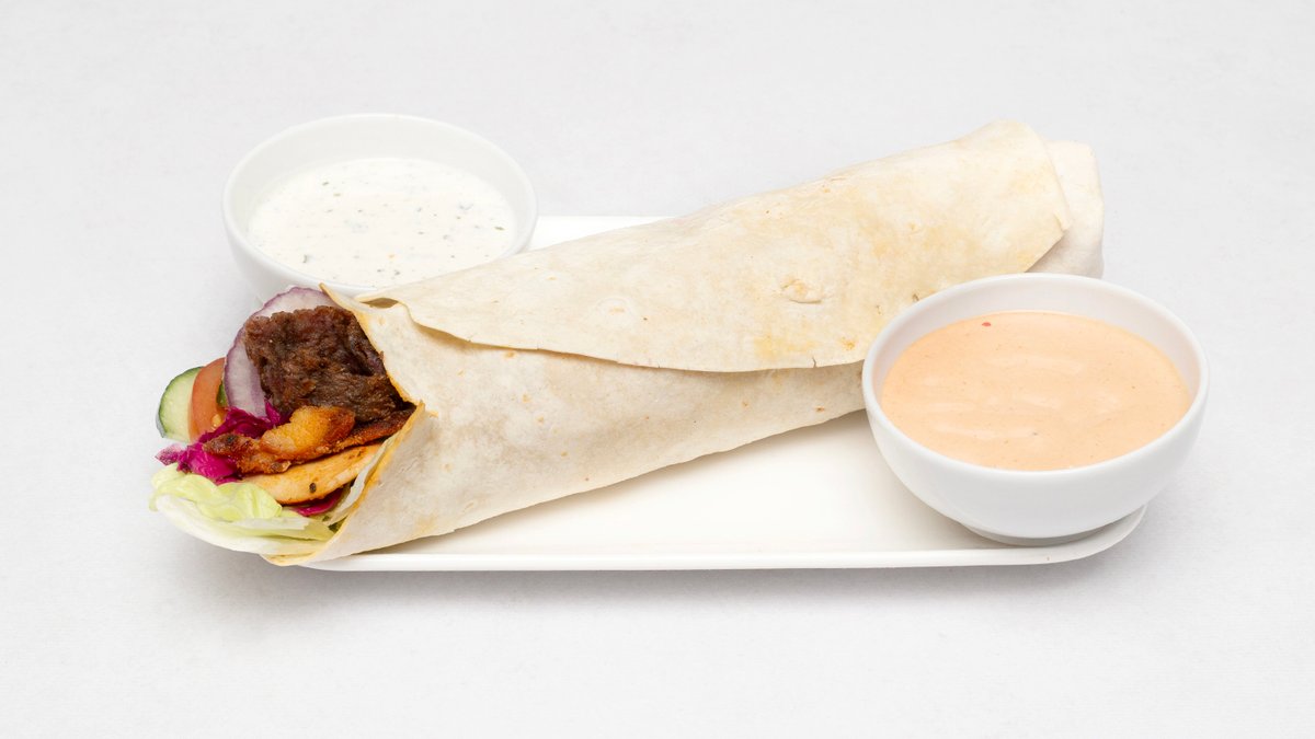 Lawasz lub pita, sos, mięso 150 g, warzywa