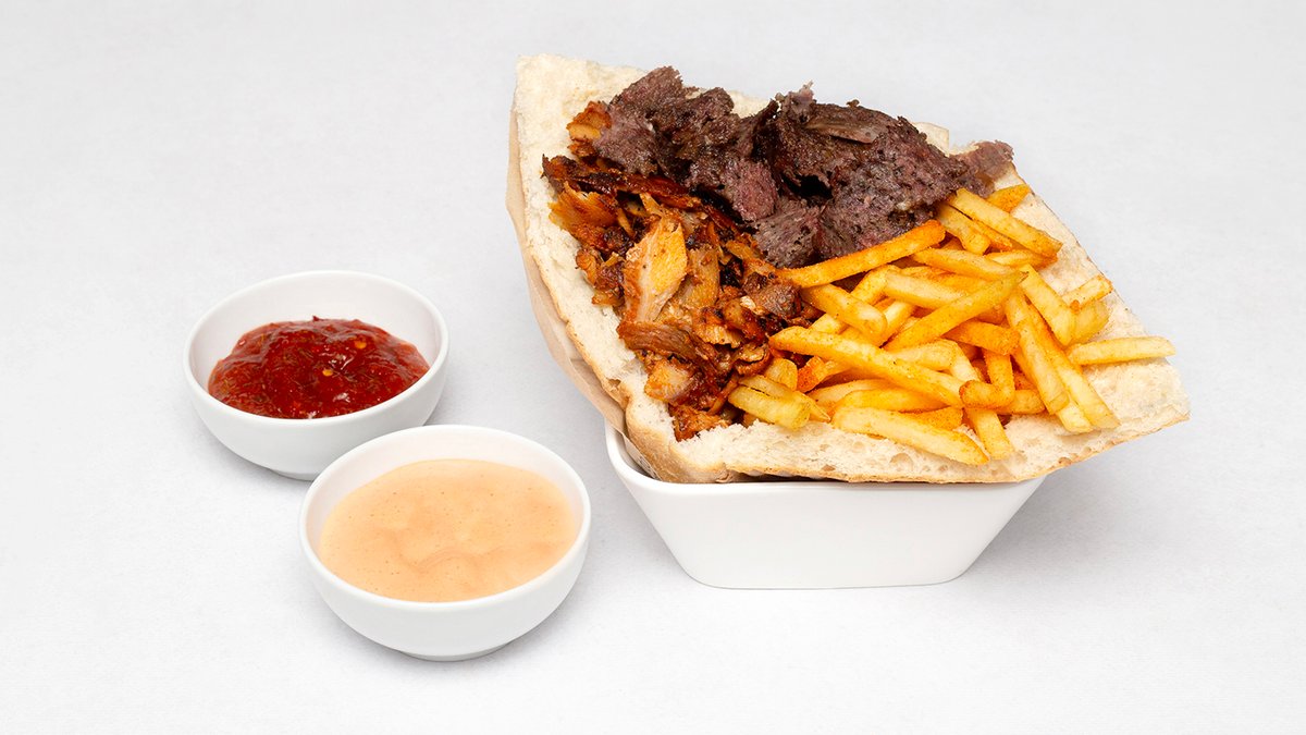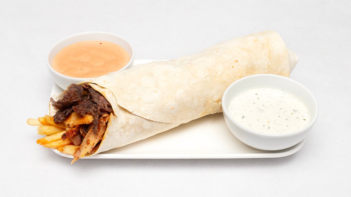 Lawasz lub pita, sos, mięso 150 g, frytki