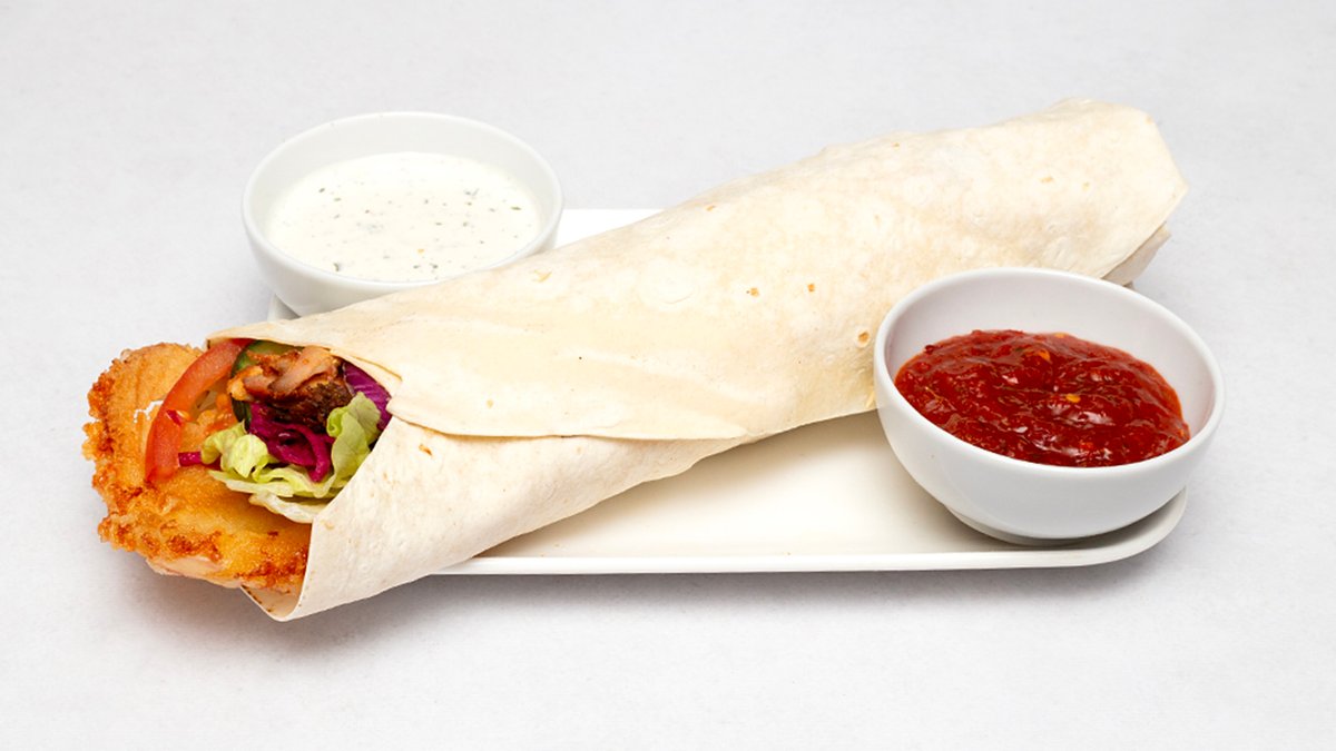 Lawasz lub pita, sos, mięso 150 g, ser smażony, warzywa