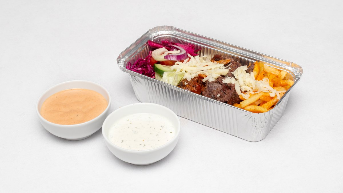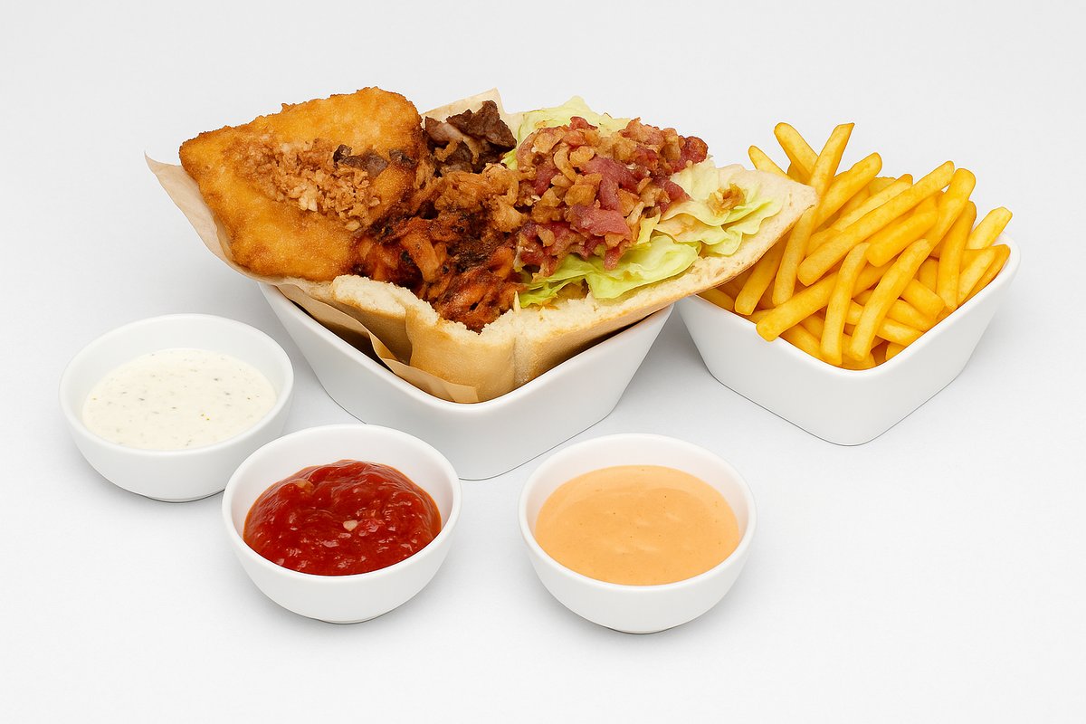 Bułka pszenna, sos, mięso 180 g, warzywa + frytki/napój