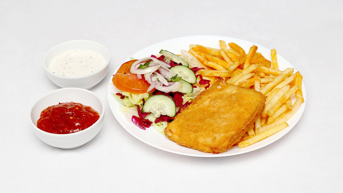 Mięso 150 g, frytki, sos, ser żółty, warzywa