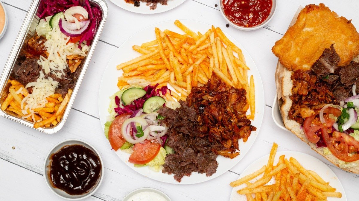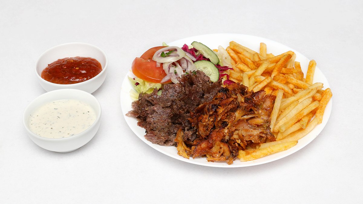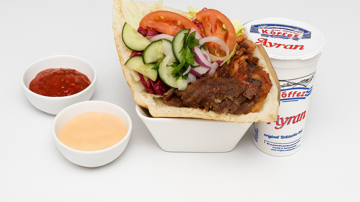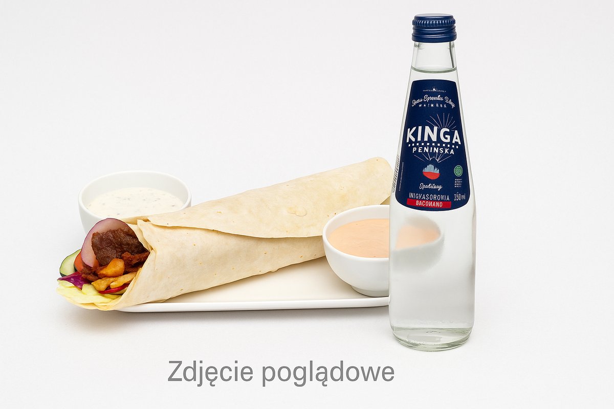 Lawasz lub pita, sos, mięso 180 g, warzywa + frytki lub napój