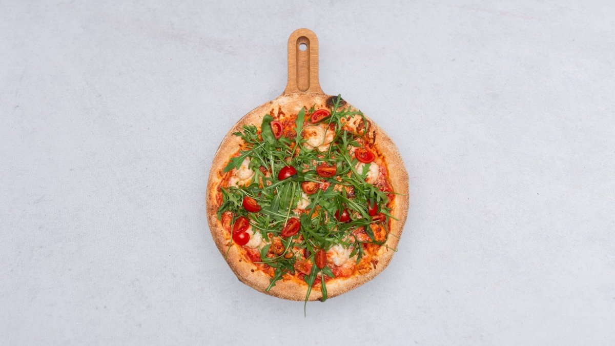 Z sosem pomidorowym, serem mozzarella, krewetkami marynowanymi w czosnku, rukolą i pomidorkami koktajlowymi