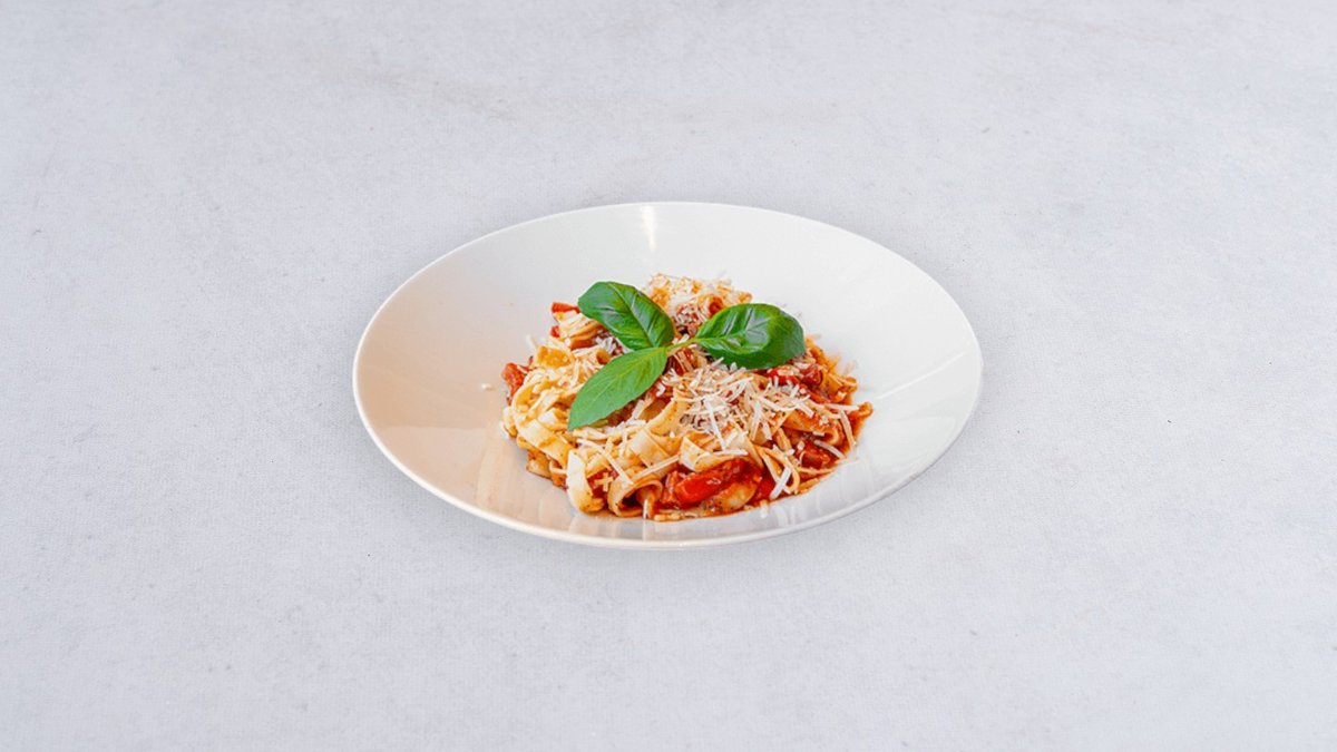 Tagliatelle z salami spianata, pomidorkami, sosem pomidorowym, bazylią i parmezanem - danie ostre